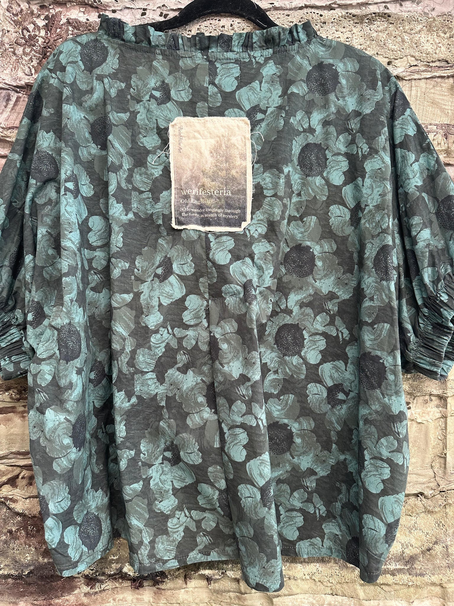 This one is 100% cotton and features frills on the collar. The sleeves are elasticated and the vintage buttons give a nice touch. The back features a flattering pleat and the high/low hem compliments all shapes making this versatile piece a wardrobe staple.