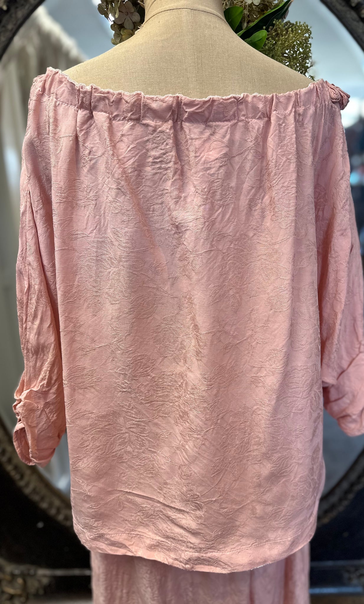 #5758 The BIANCA ROSE has arrived just in time the busy event season!! With 3/4 sleeves finished in delicate rooshing and a Linen - Viscose fabric, this versatile on or off the shoulder top has matching Palazzo pants and Rooshe Skirt.