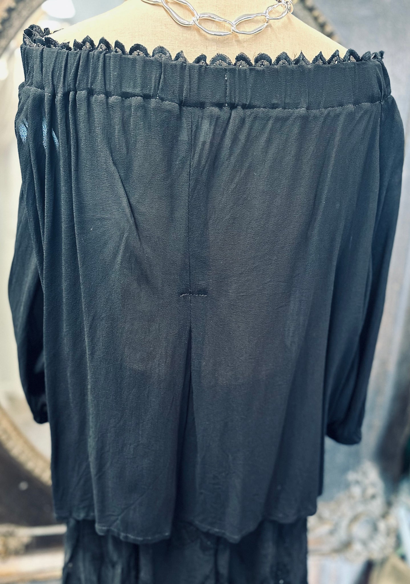 With elasticated 3/4 sleeves and a soft Viscose fabric, this versatile on or off the shoulder top has matching Palazzo pants. The dainty top stitching details allow this top to fall effortlessly over the waist and finishes on the hips.