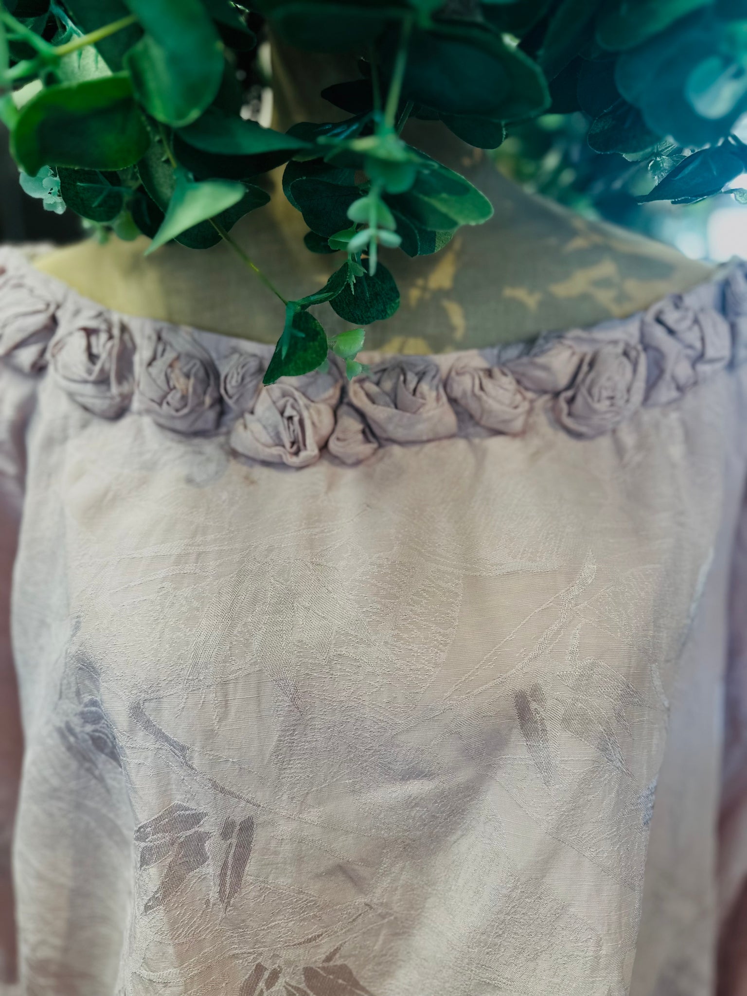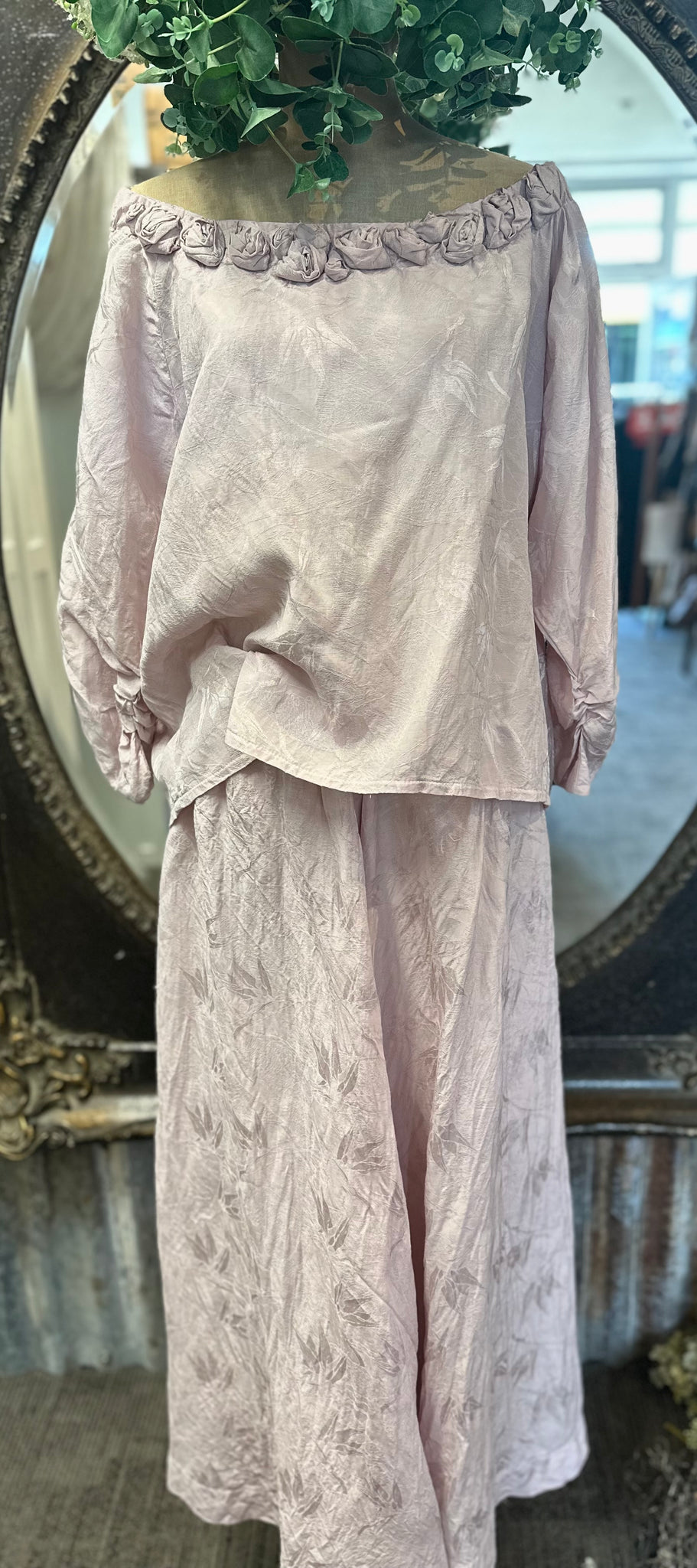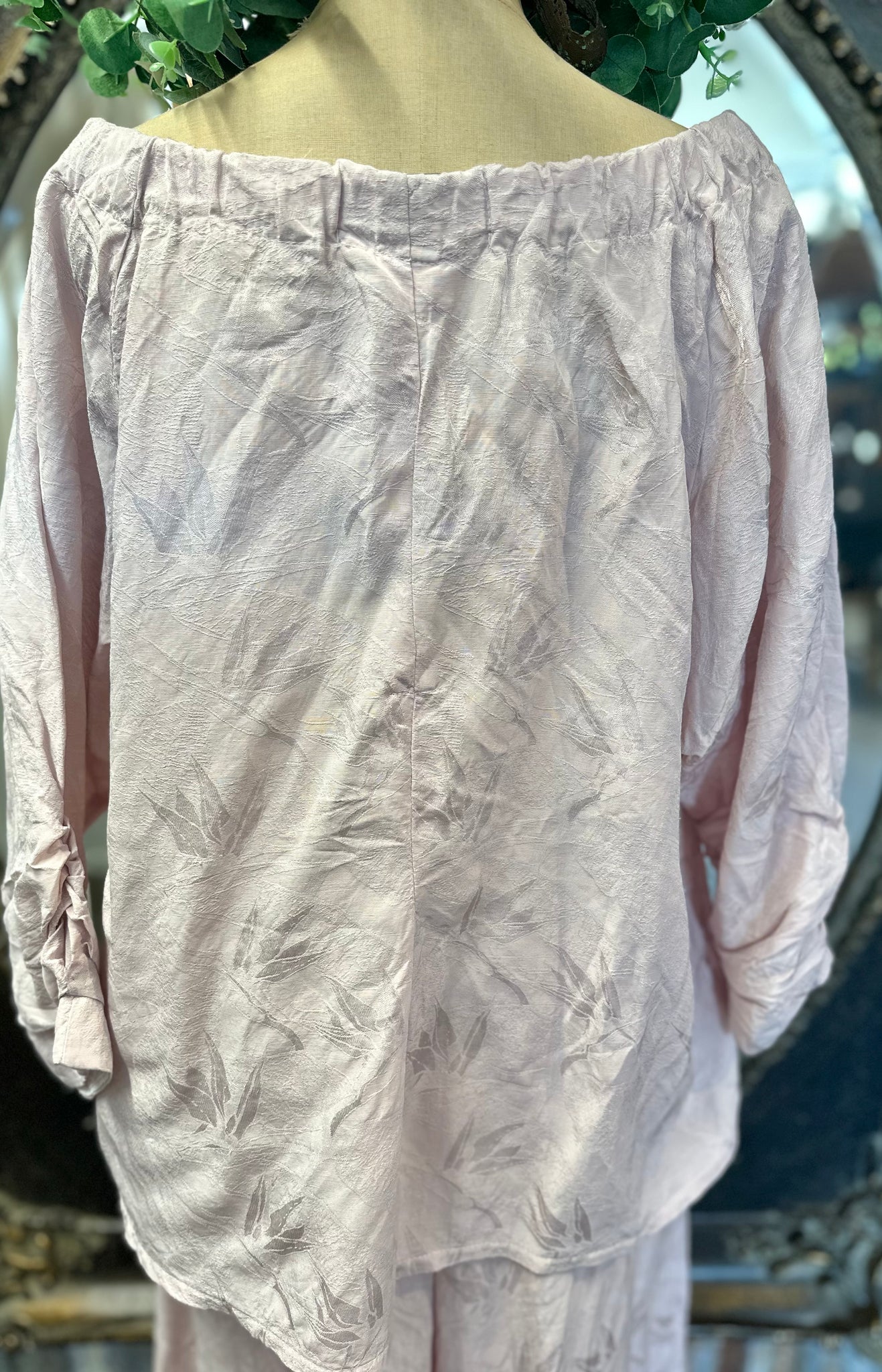 The soft muted pink hues give a lux but also casual look. Pair with Palazzo Pants a rooshed skirt or your favourite denim pieces for any occasion.