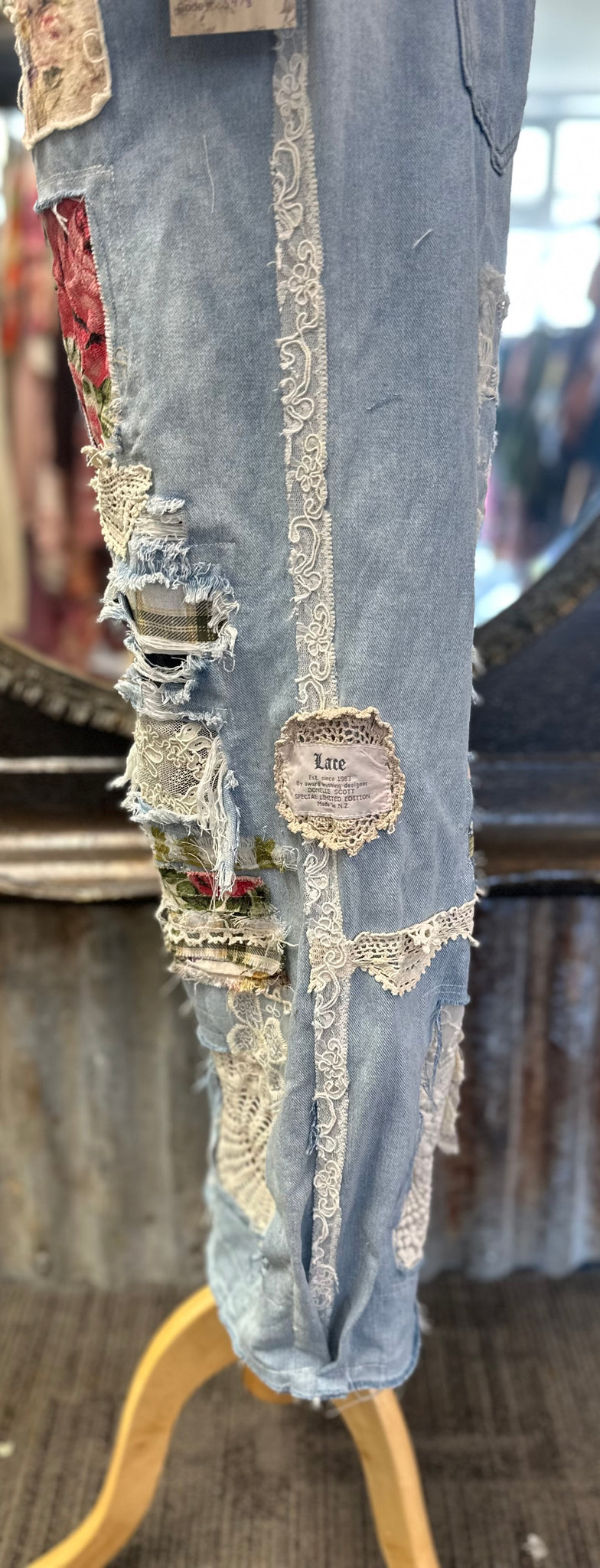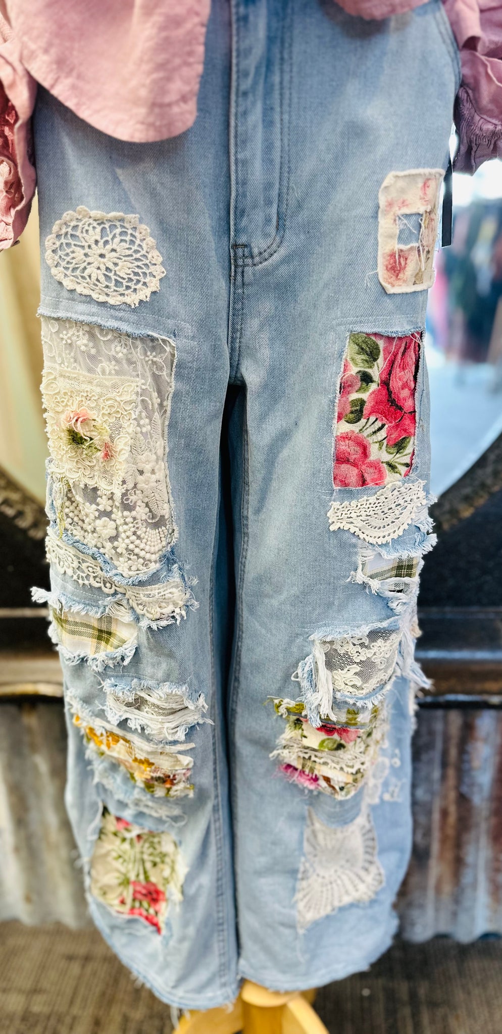 #5978 Patch jeans with vintage fabrics and lace and made individually with love 💗