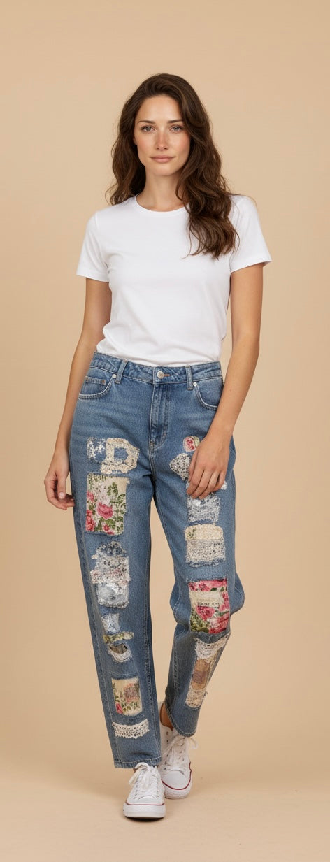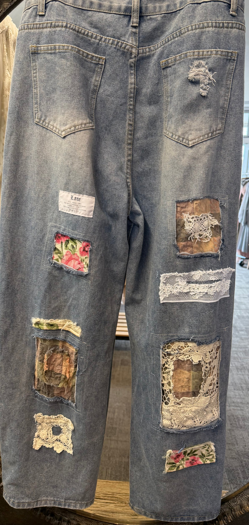 #6124 Vintage lace and fabric patched jeans with heart and soul 🩷💕 individualism at its best!These designer jeans are created uniquely and each pair has its own personality. Easy wear with the loose fit - pleated at cuff .