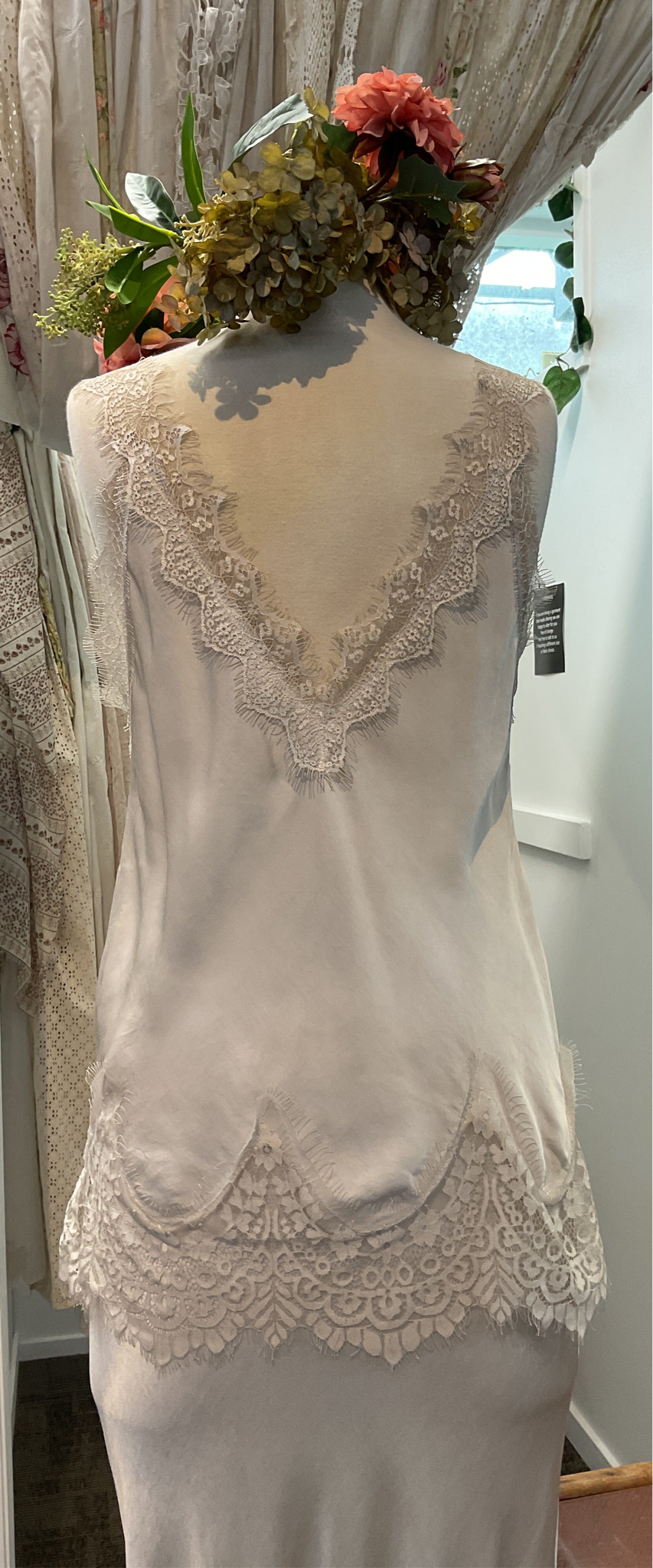 Lace detail on the front neckline, the back neckline and the hem falling to hip length. Cut on the cross giving a nice stretch.