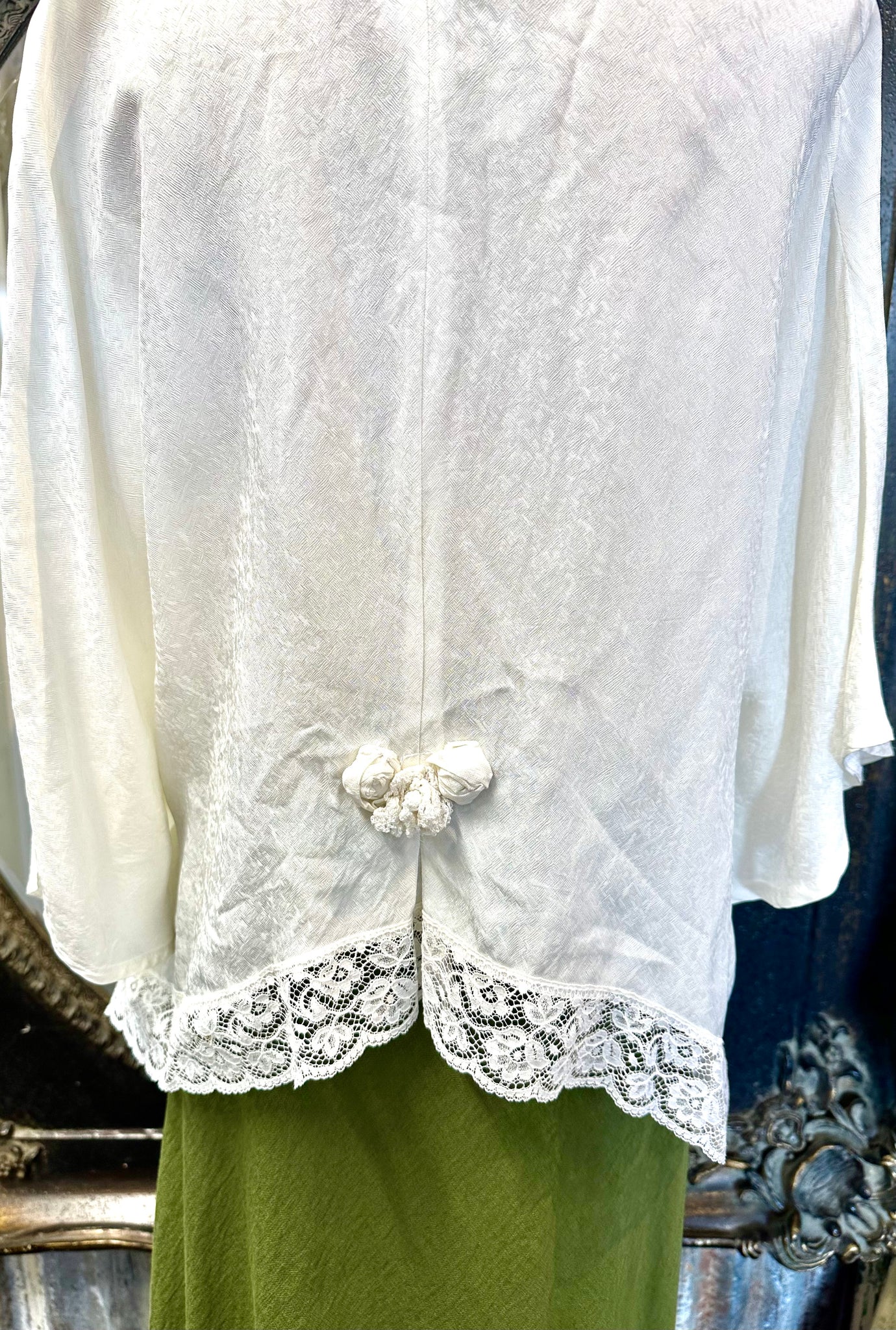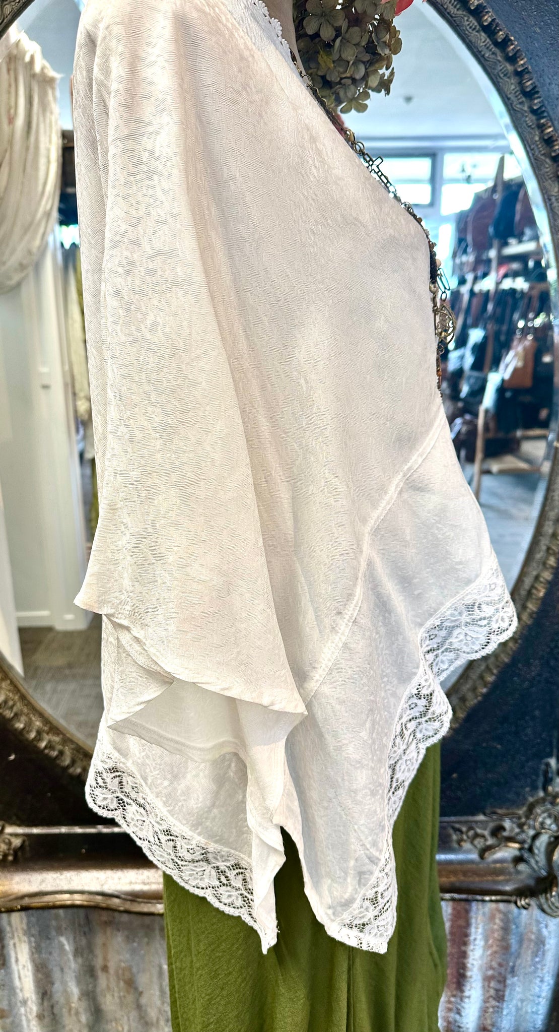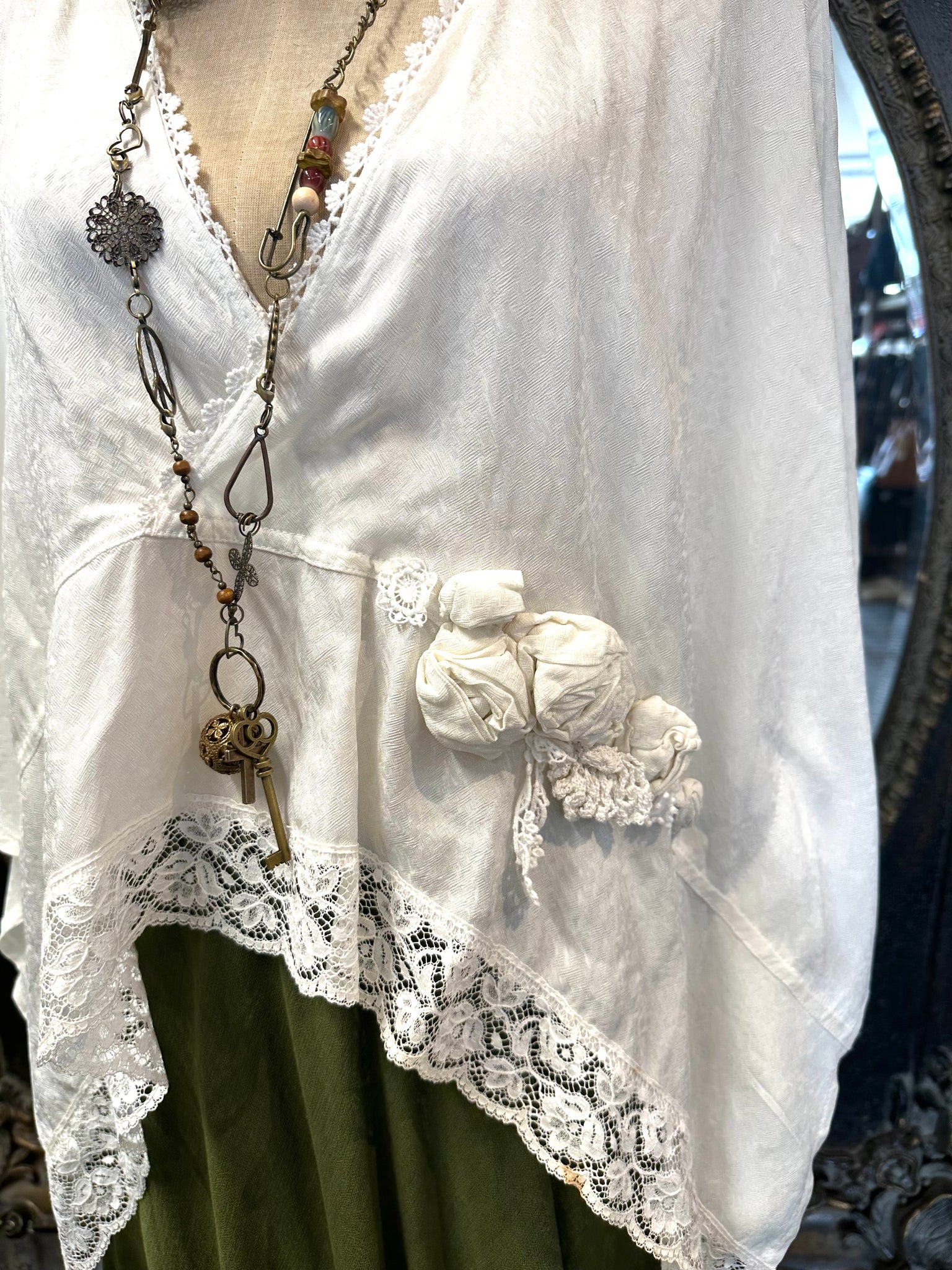 #5787 Enter the CROSSOVER! Welcome the new season with this roses inspired top to dress up or down.. Delicate roses on the bodice and lace edging give this vintage inspired top a unique take on the classic crossover.