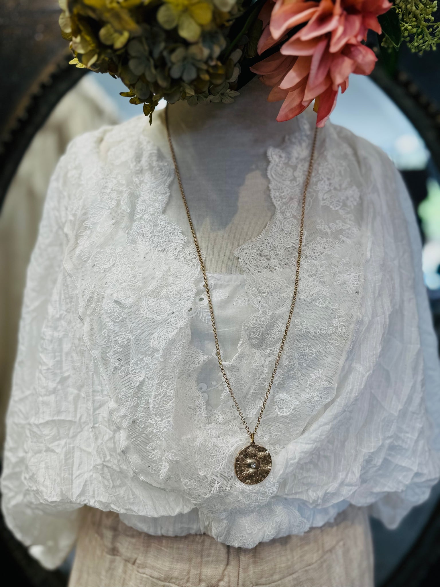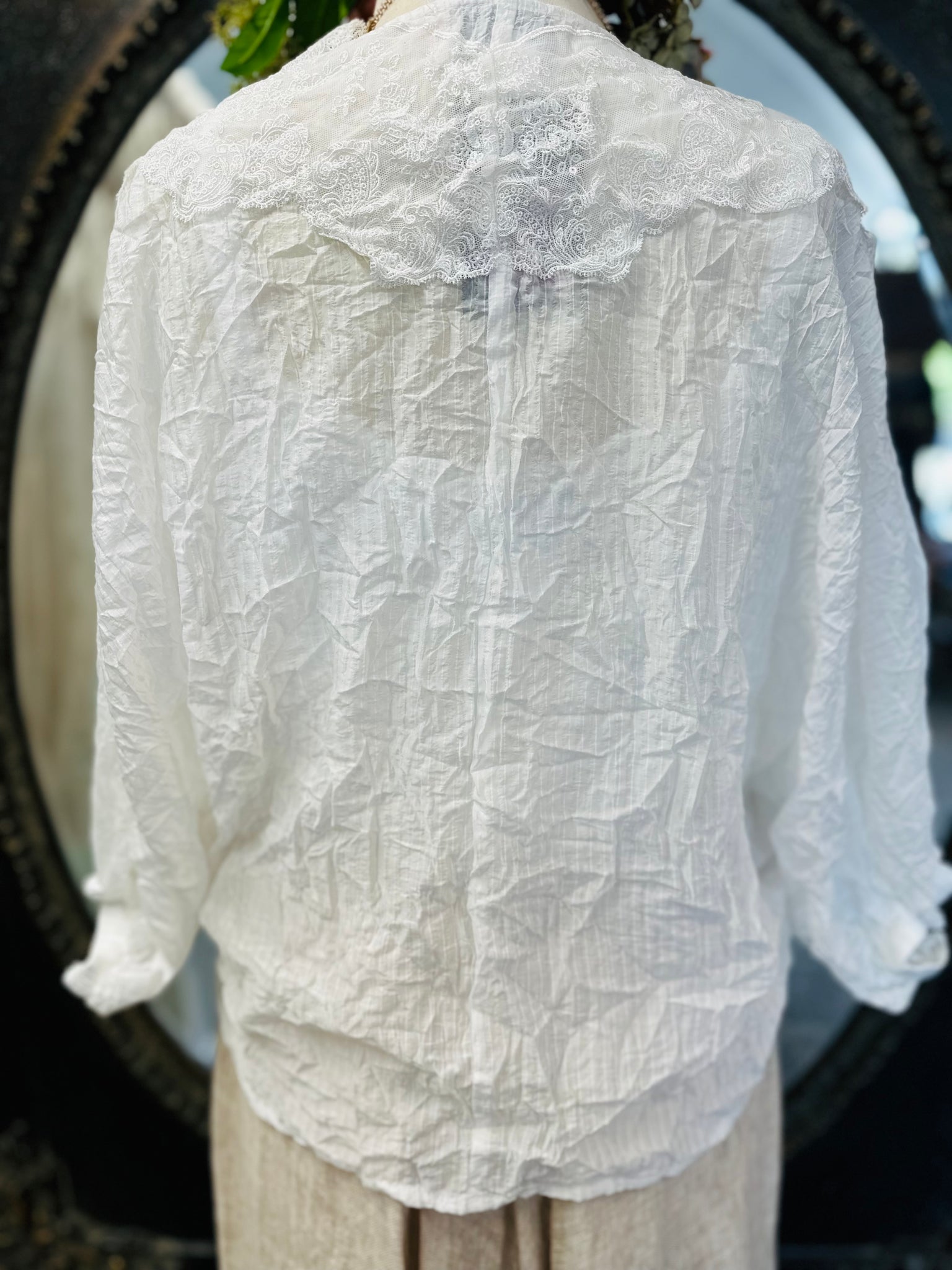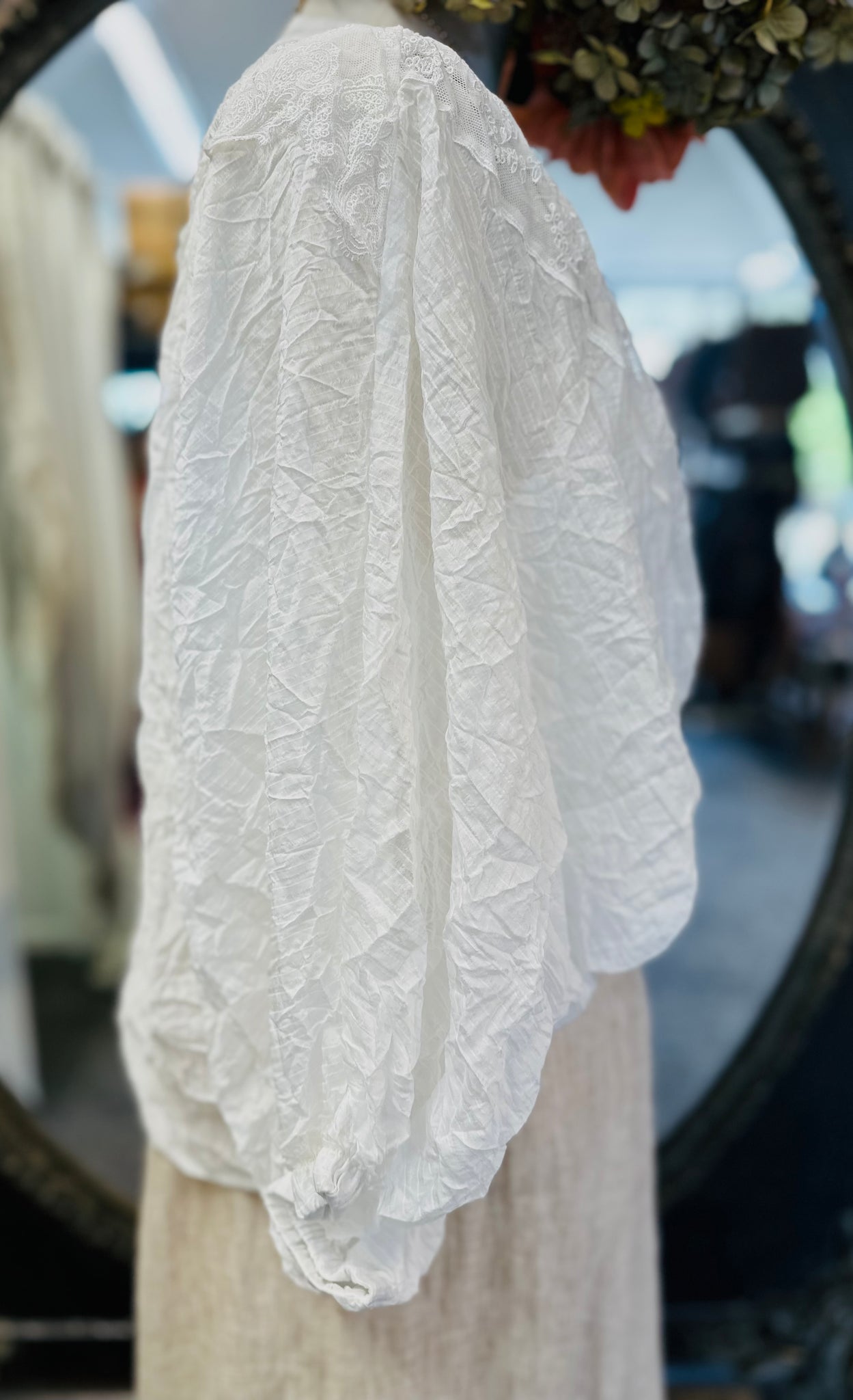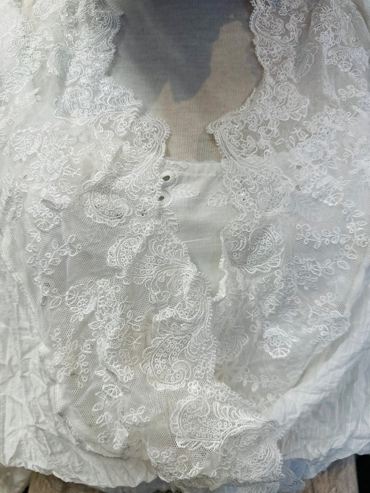#5965 Adorable top featuring French vintage style lace on the front cross panels. Elasticated sleeves finish at the elbow in a soft gather.