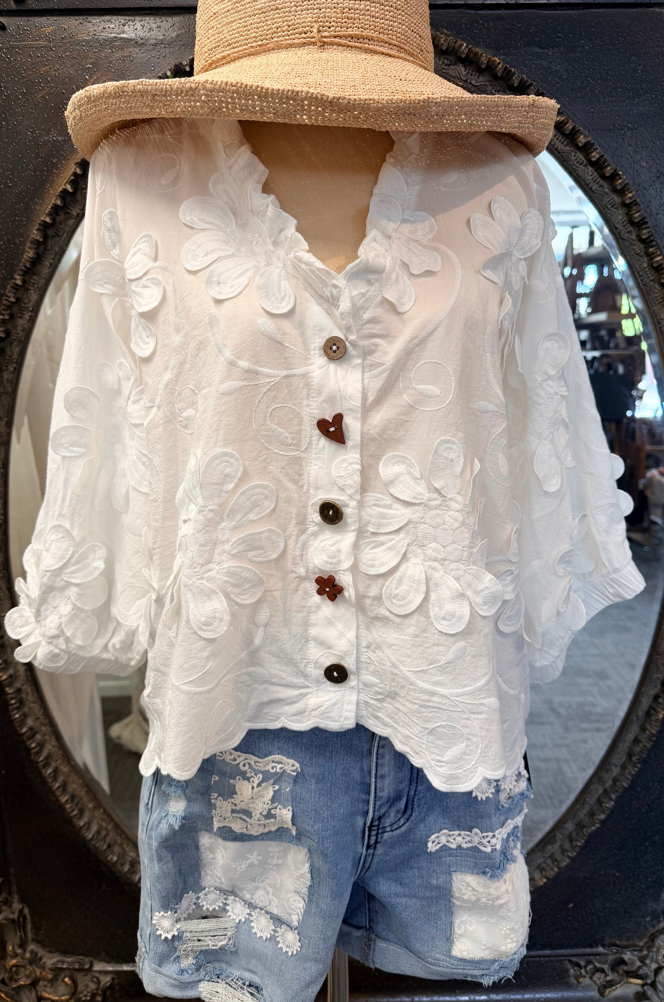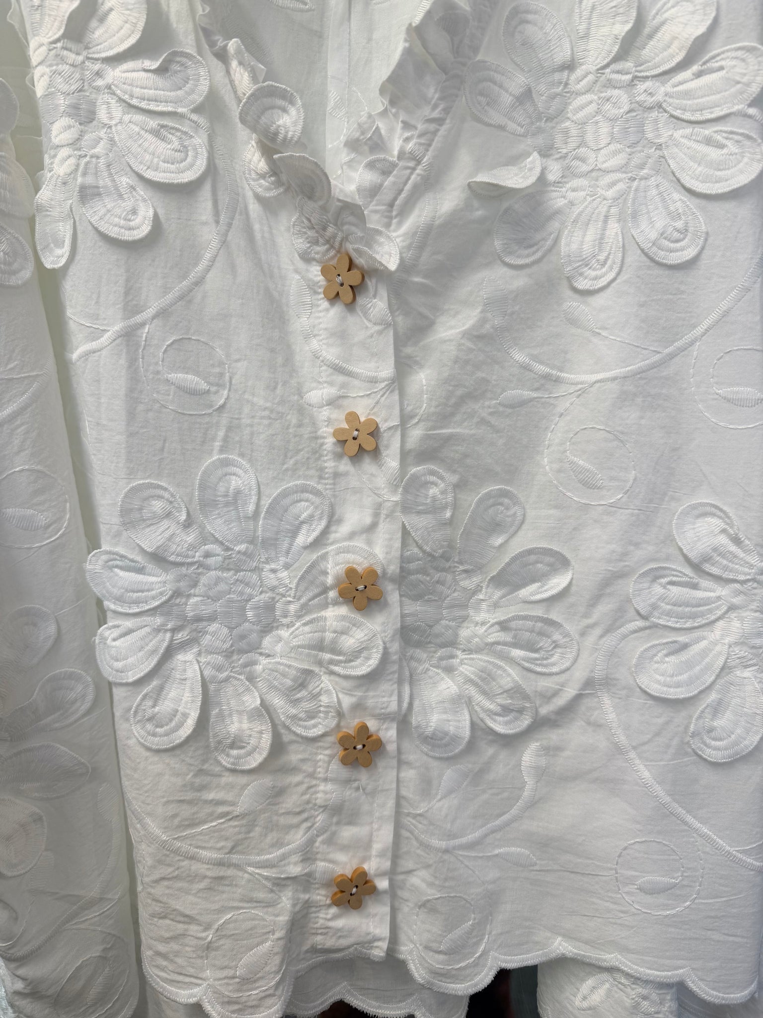 This one is 100% cotton and features frills on the collar. The sleeves are elasticated and the vintage buttons give a nice touch. The back features a flattering pleat and the high/low hem compliments all shapes making this versatile piece a wardrobe staple.