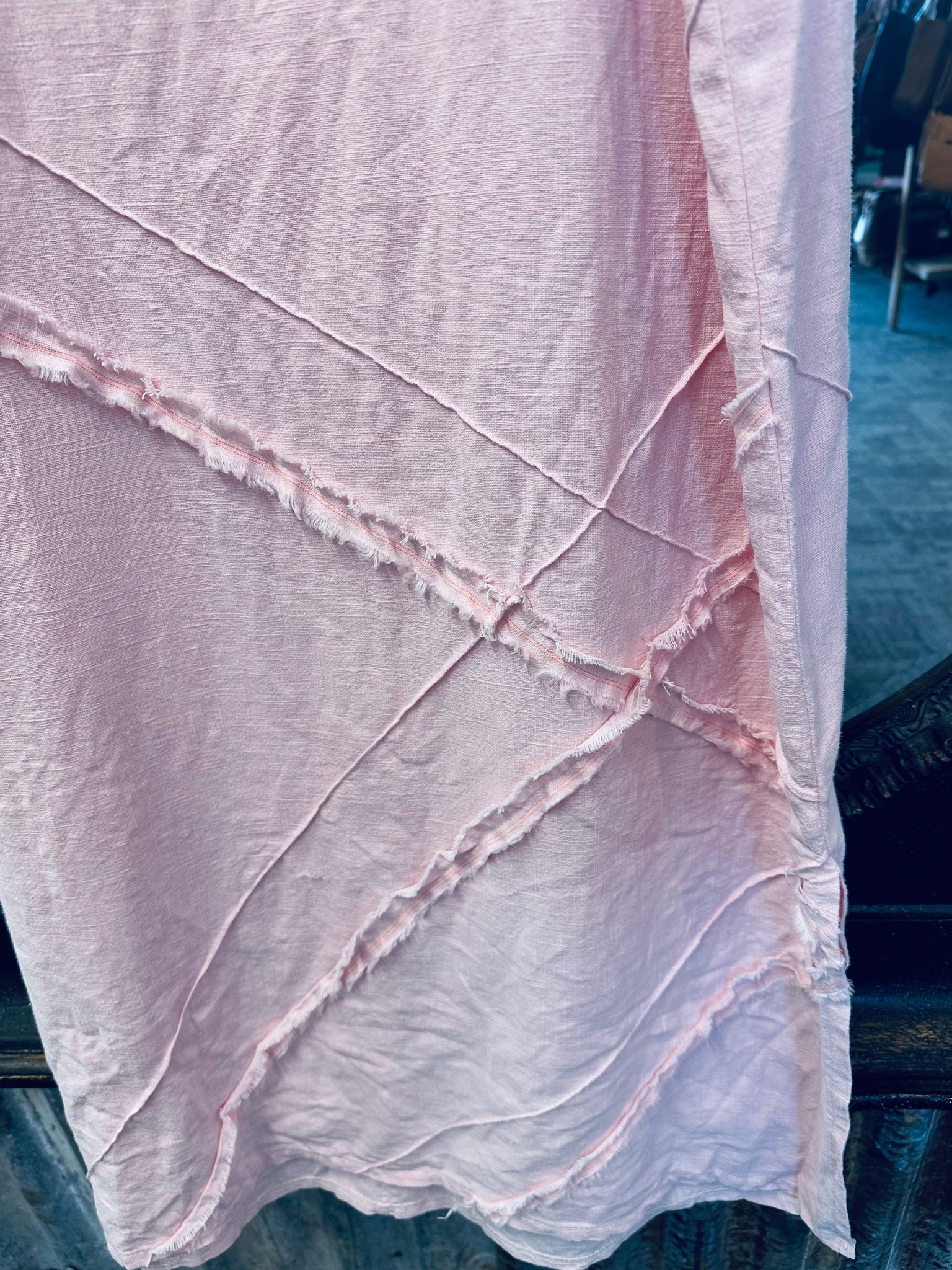 #5963 Soft BABY PINK dress with wide straps and raw edge details on the front. A square neckline and a side split give a casual vibe. Go from morning to evening effortlessly with your favourite sandals or sneakers.