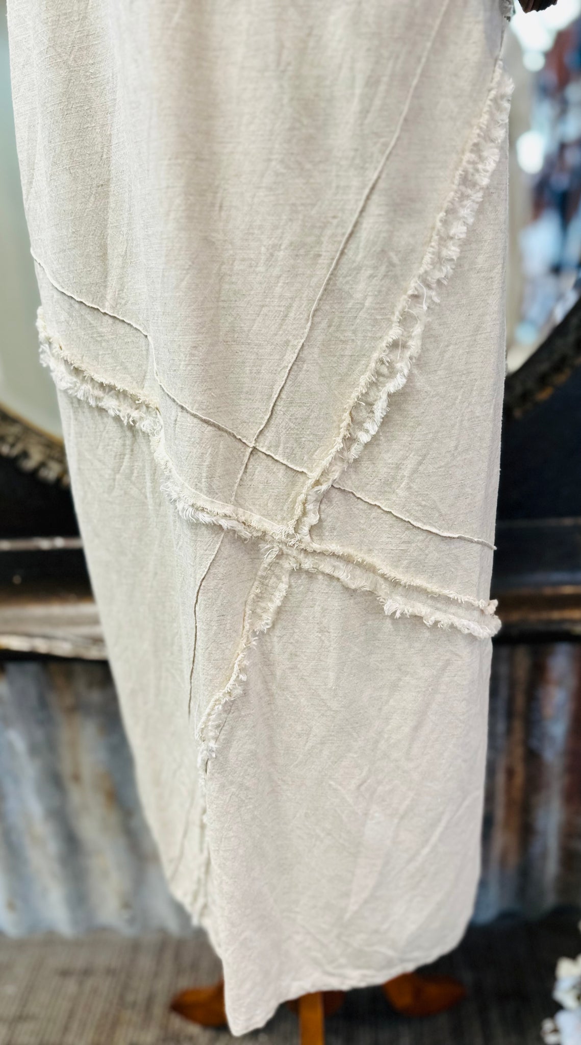 The linen fabric enhances the structured style. Featuring a soft NATURAL shade to highlight our signature designer ROOSHE details