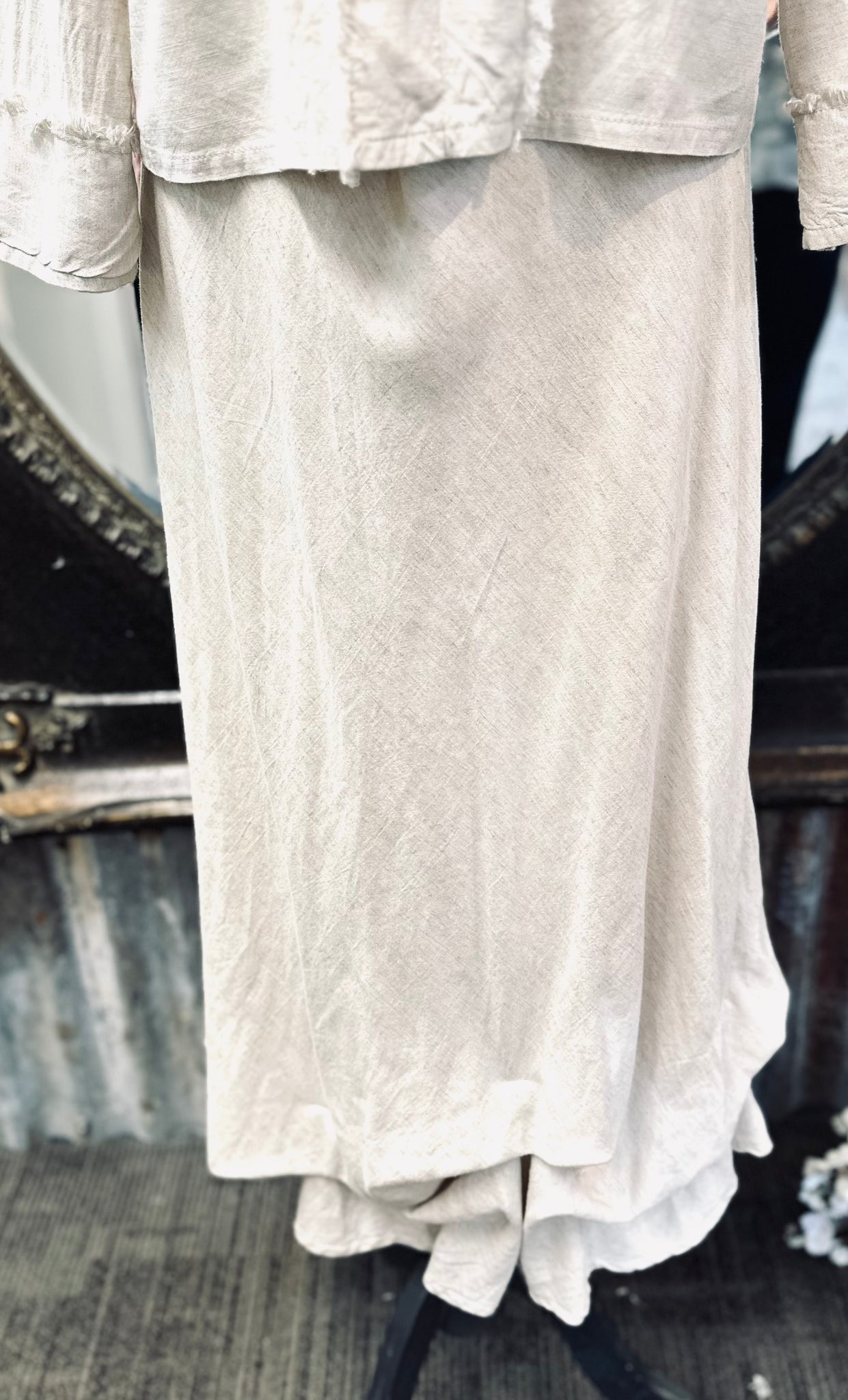 5751 Welcome to the FRAY! Our new skirt is lined with an elasticated waistband to ensure soft drape and movement, this design sits comfortably, falling to a flattering high / low hem.