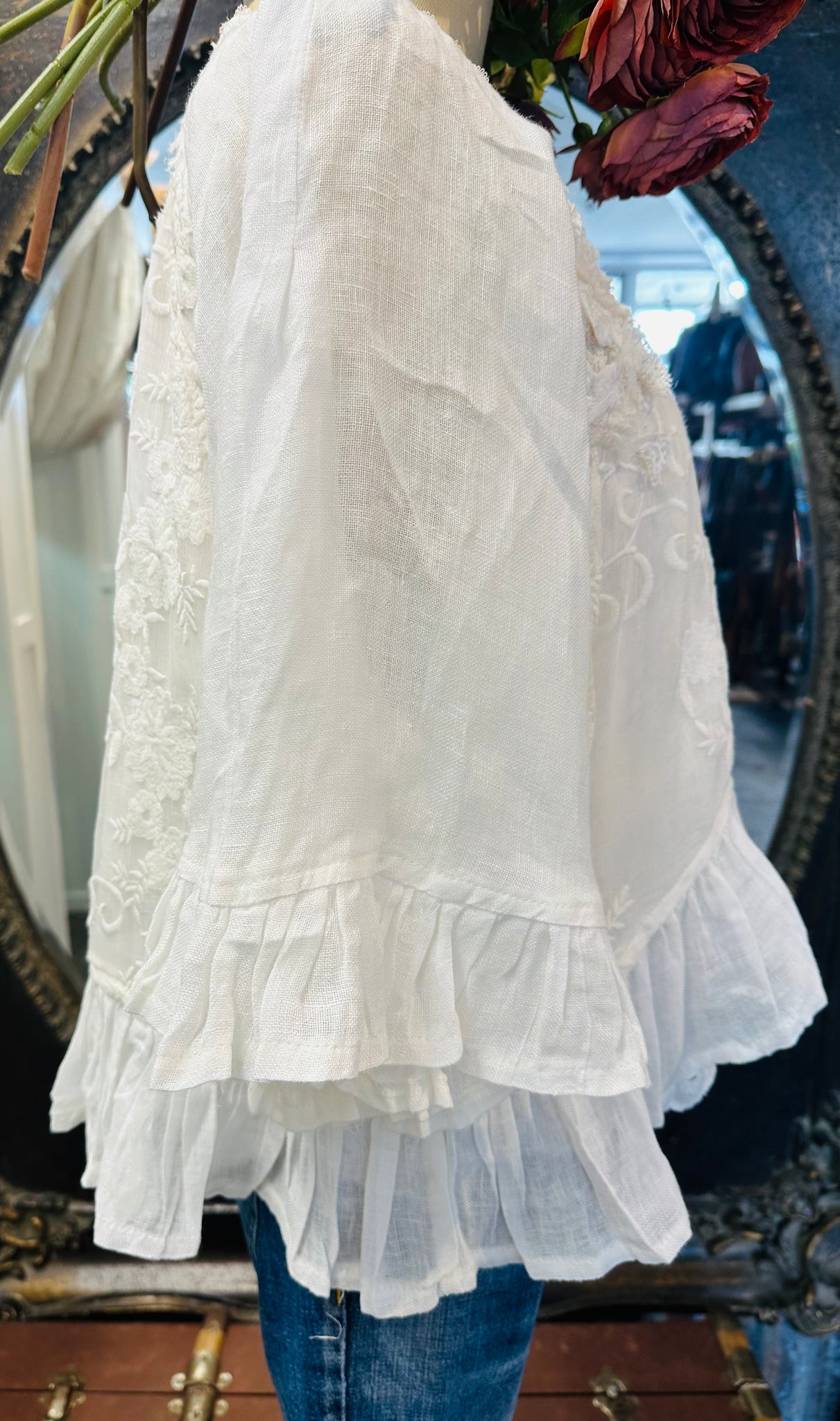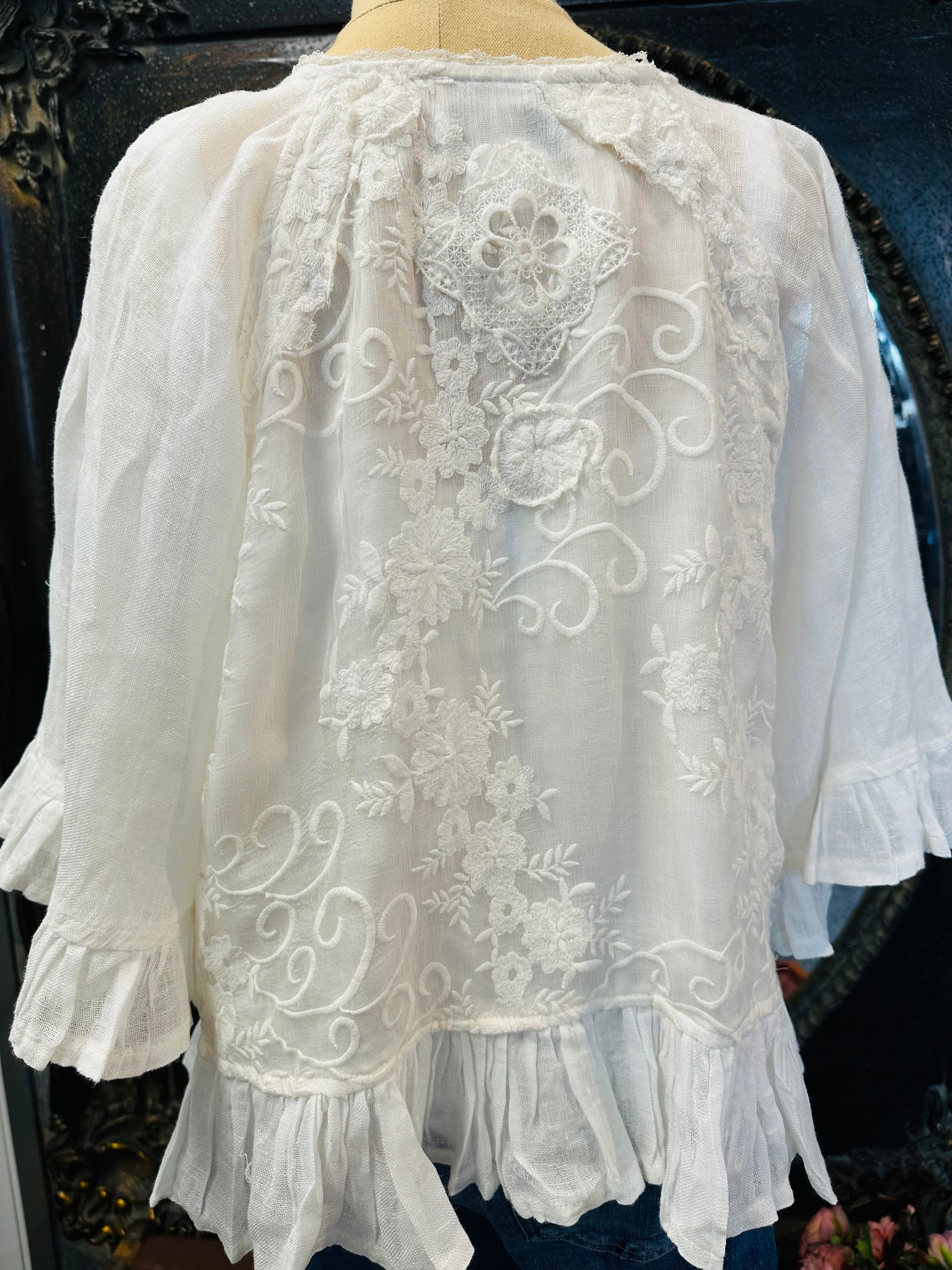 This original piece is in a crisp white soft linen.