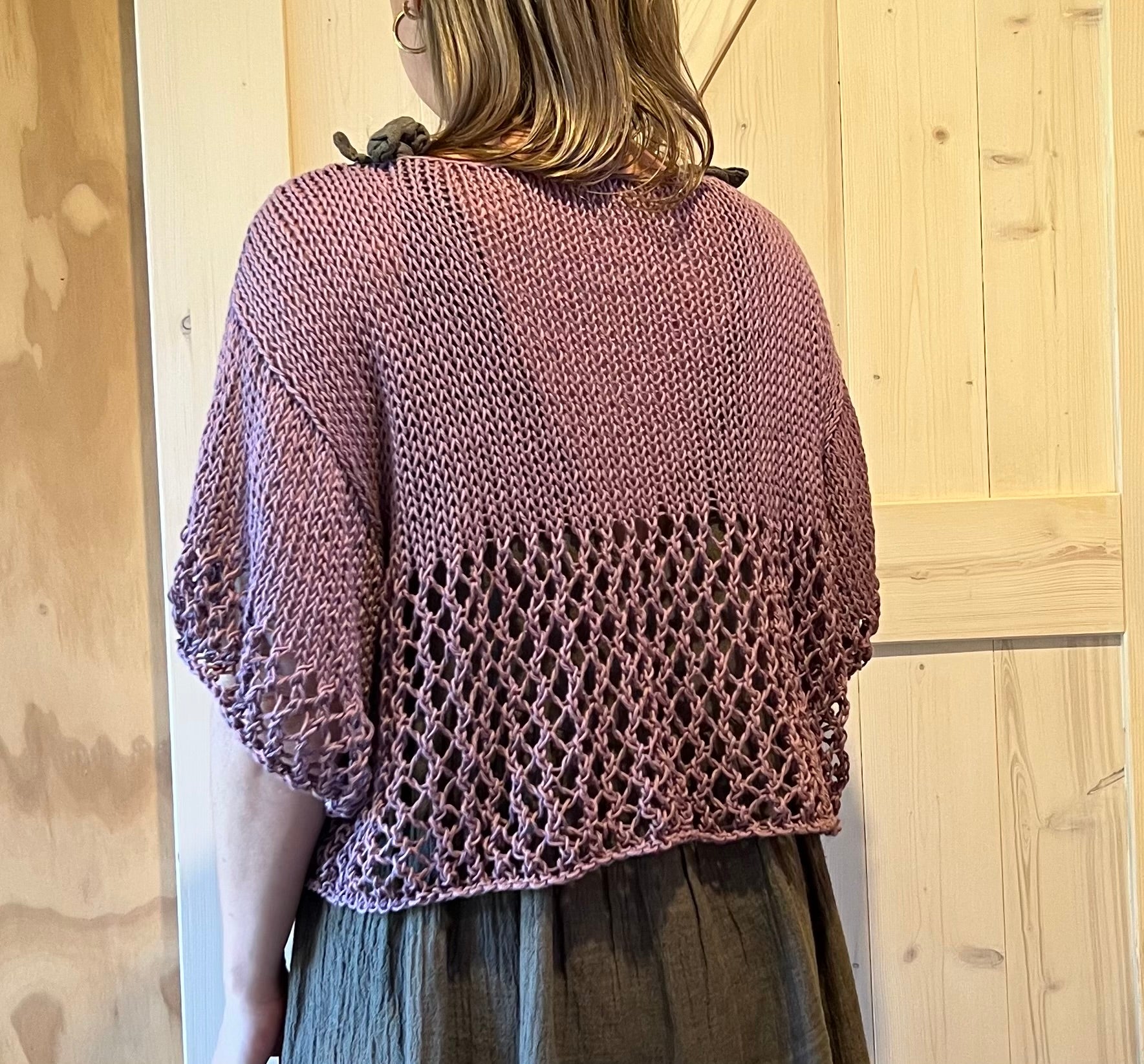 #59430 A new addition this season is the cropped cotton top. Featuring Lacey pattern for the look of the season, this hand knitted gem . Pop over a strappy dress or a singlet style top to add a soft layer for your errands or event!