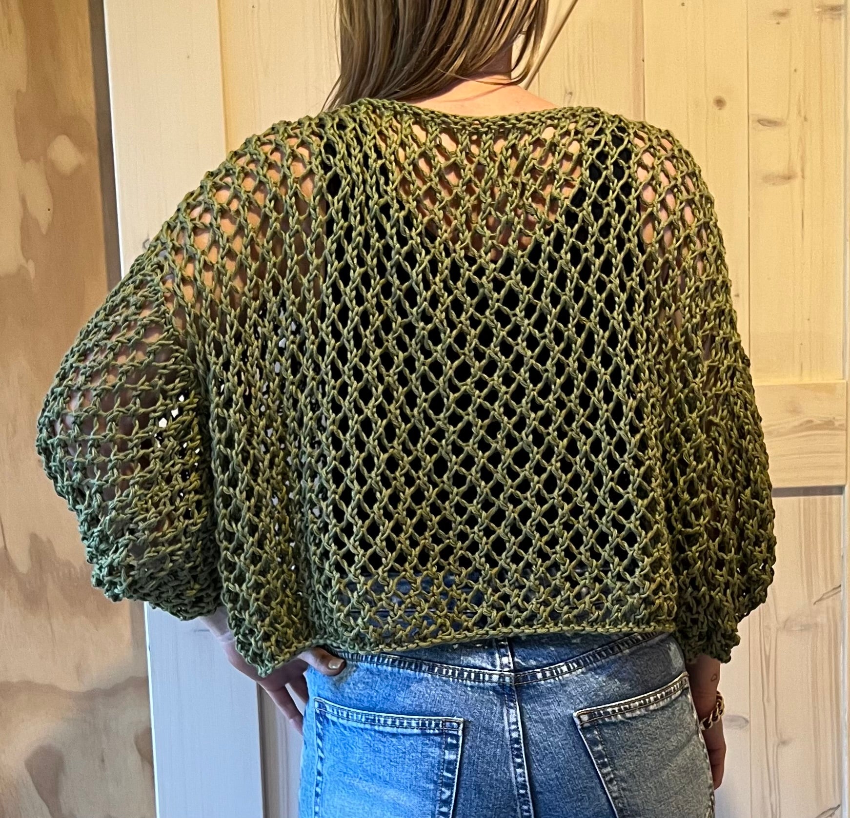 #59420  A new addition this season is the cropped cotton top. Featuring Lacey pattern for the look of the season, this hand knitted gem .  Pop over a strappy dress or a singlet style top to add a soft layer for your errands or event!