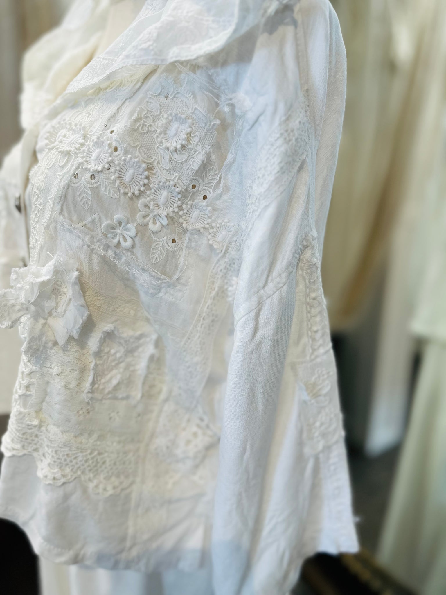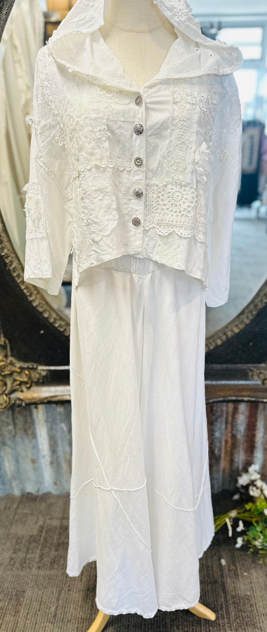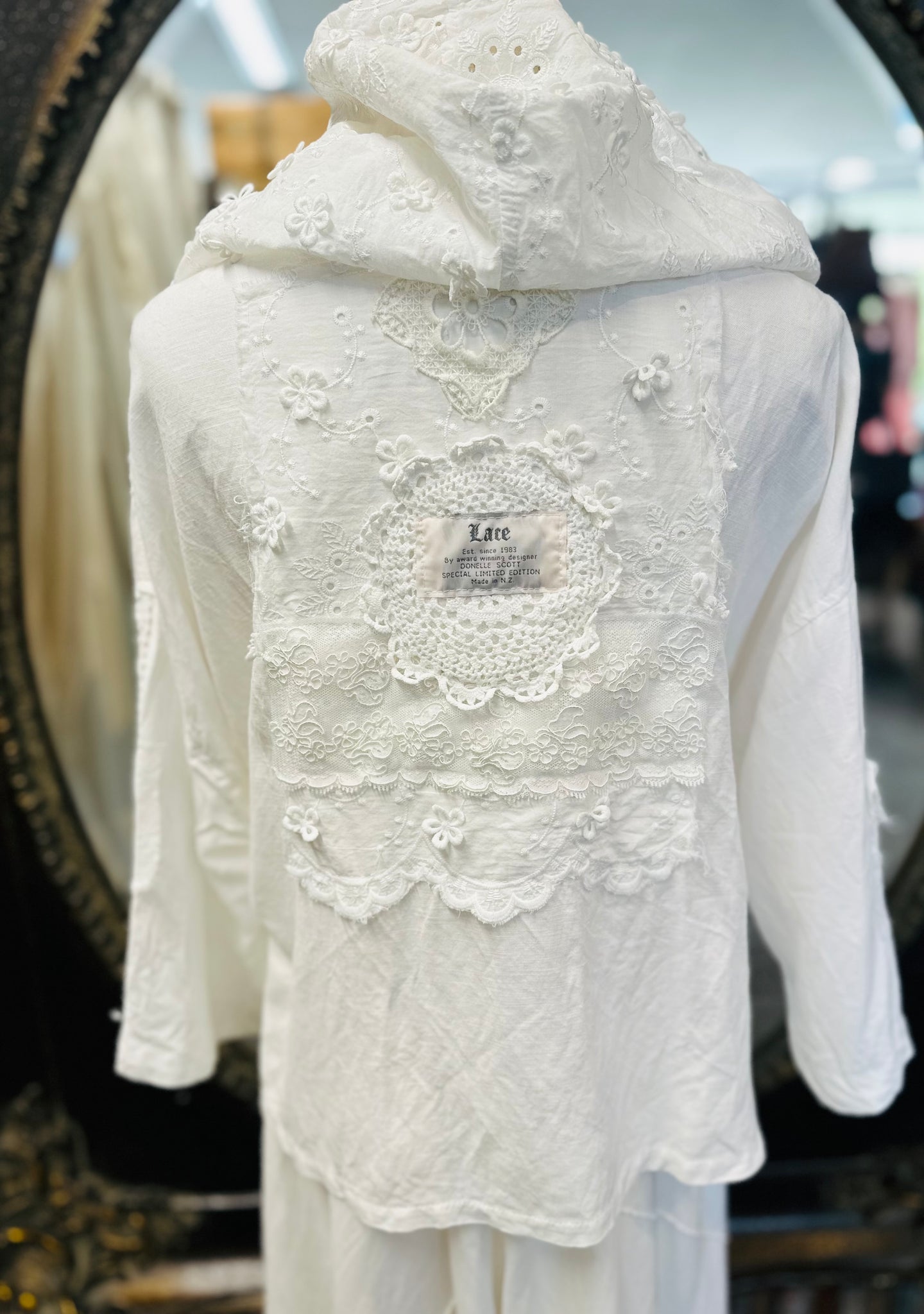 #5781 The detail on this sweet jacket is unmissable! Vintage inspired styling meets exclusive designs from Nellie Wilde. Donelle has embraced linen and created an everyday, special event cropped over top. The hood is Broderie Anglaise and the silver vintage buttons elevate this top to be worn over denim’s or your favourite summer dress.
