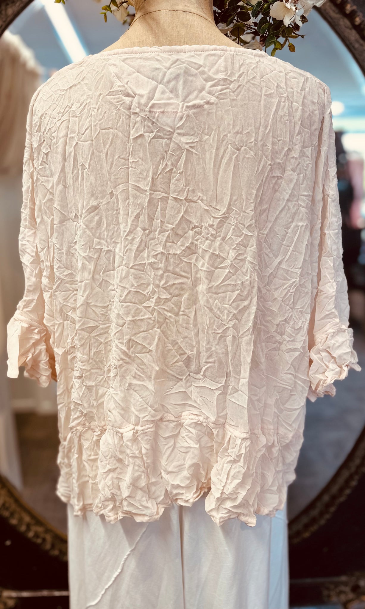 #5755 Soft, flowy and very pretty, this overtop is an original design from Donelle showing how versatile the Nellie Wilde brand is. Features include an easy care fabric, frills on the sleeves finishing at elbow length.