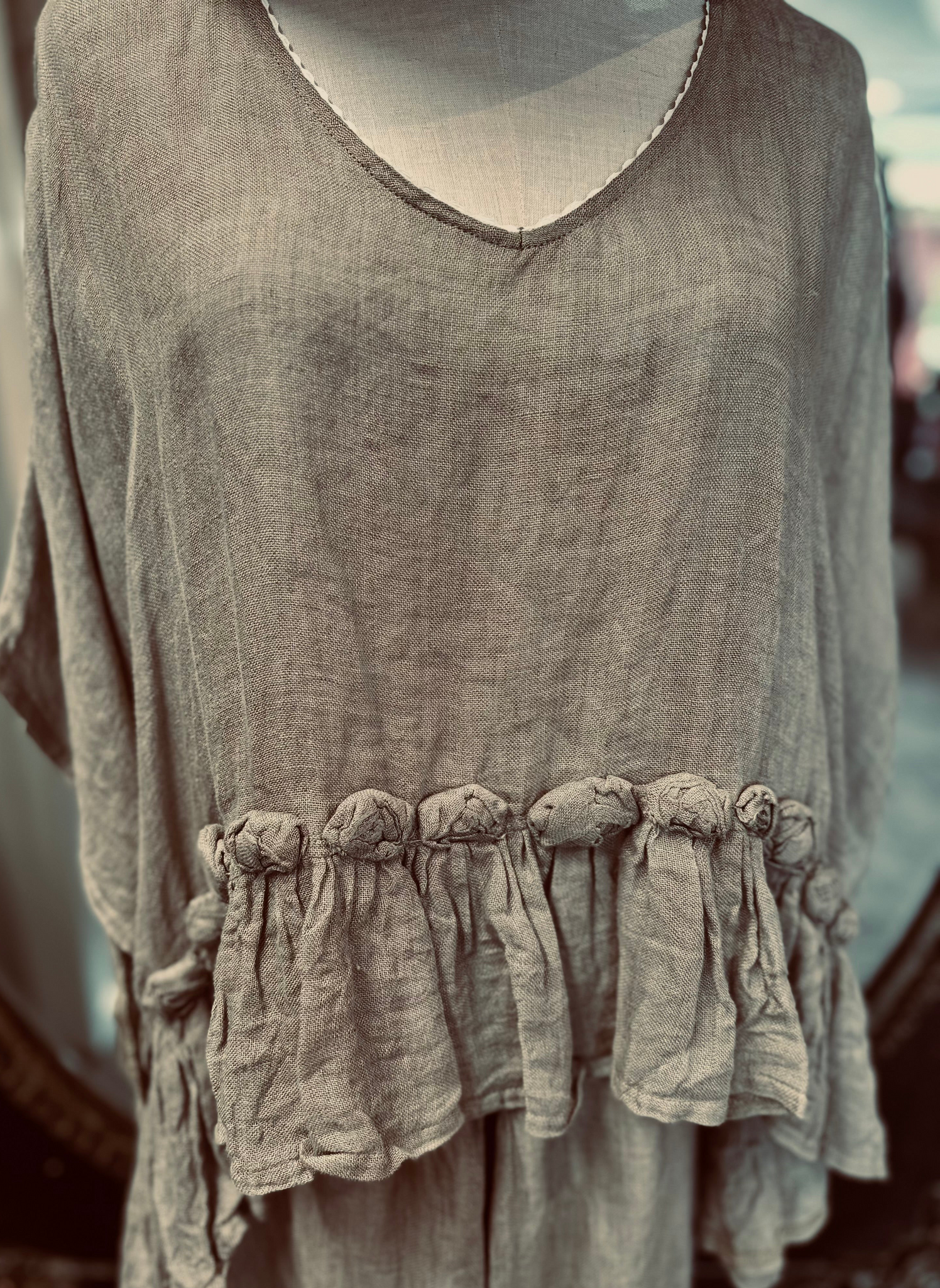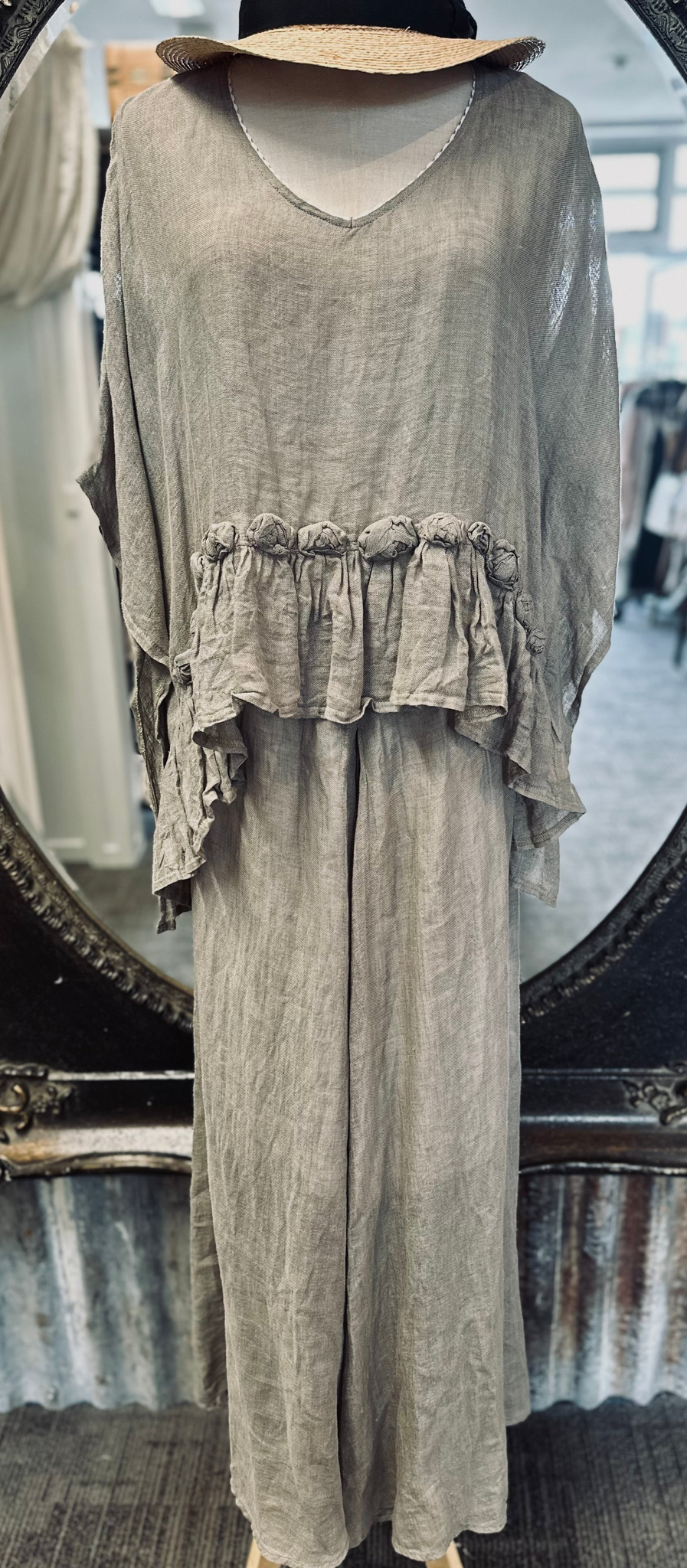 #5759 Soft, flowy and very pretty, this overtop is an original design from Donelle showing how versatile the LACE brand is. 100% LINEN fabric in a soft MOSS shade. Our handmade delicate roses showcase your outfit.