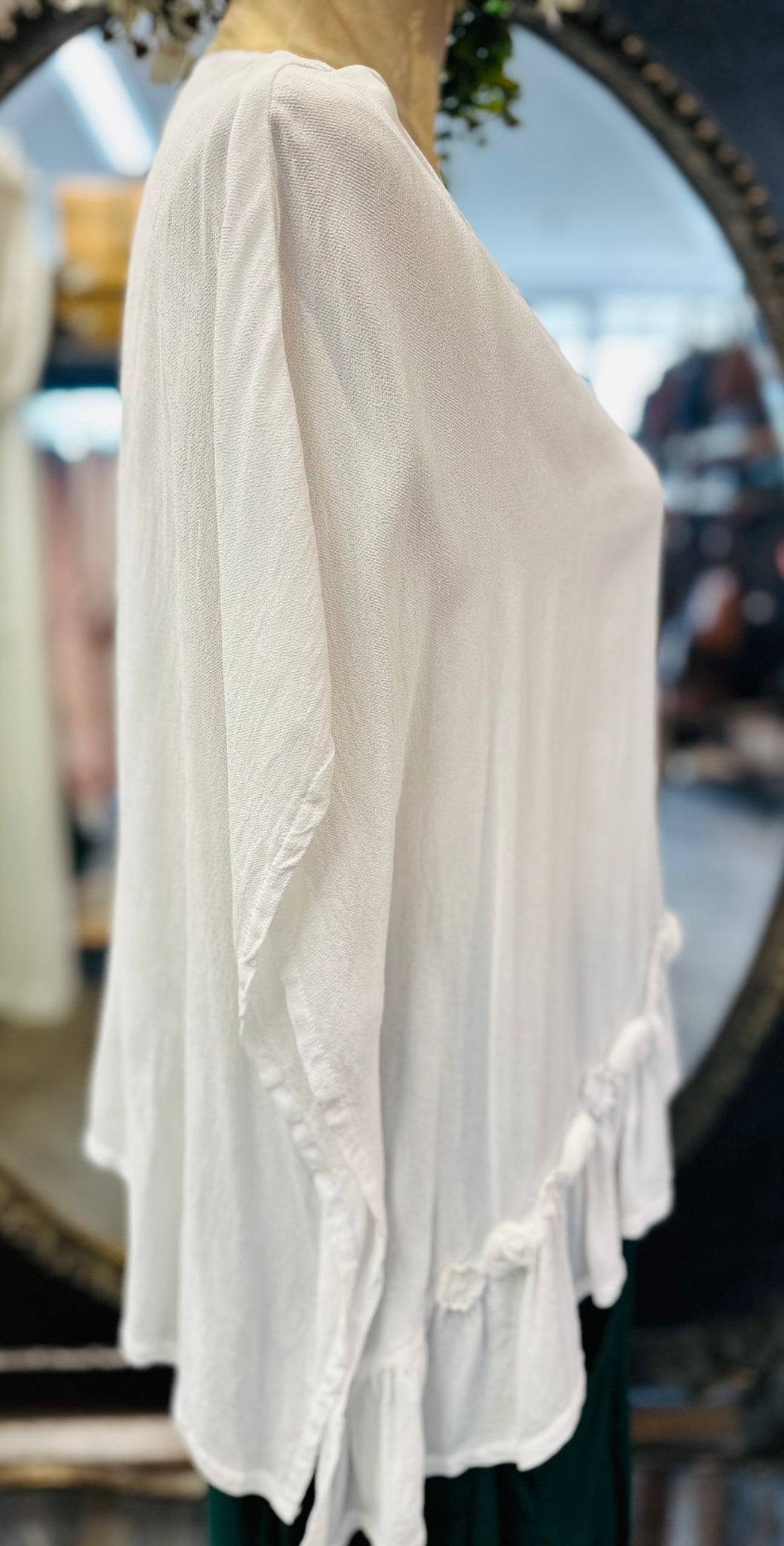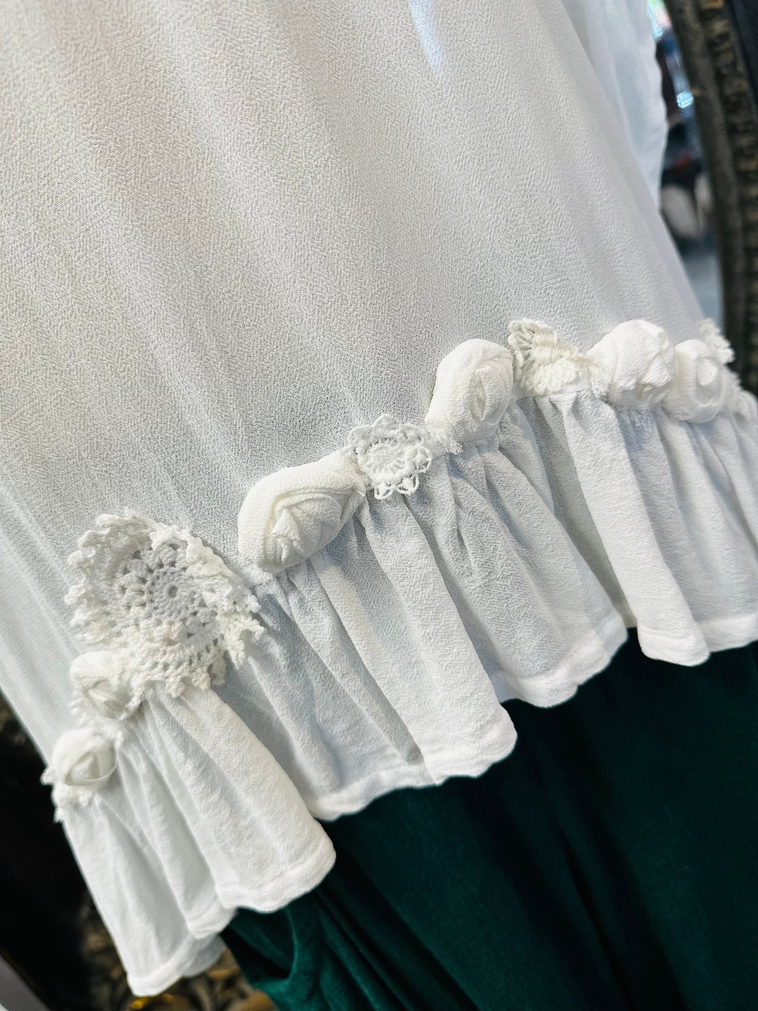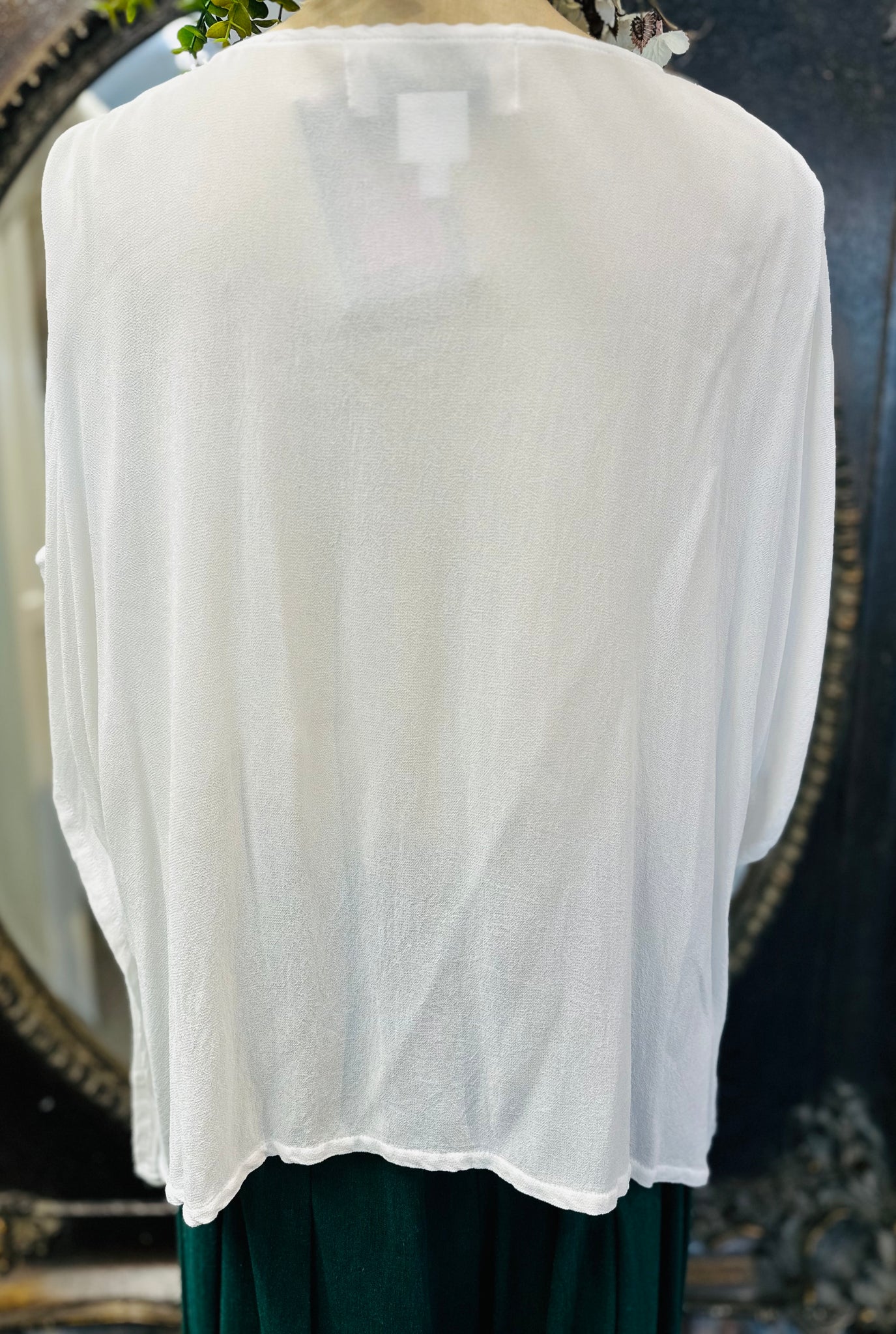 #5765 Soft, flowy and very pretty, this overtop is an original design from Donelle showing how versatile the LACE brand is. Features include a beautiful Viscose fabric in a soft OFF WHITE shade featuring our delicate roses to showcase your outfit.