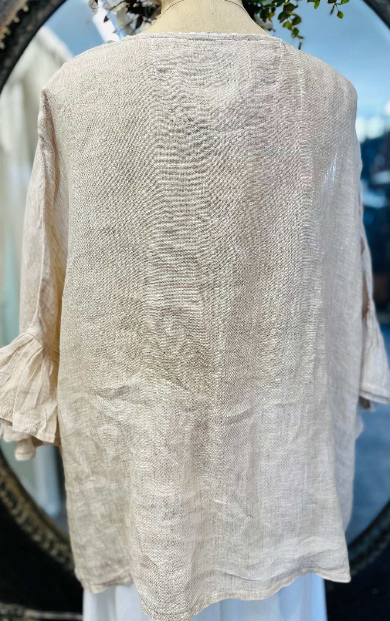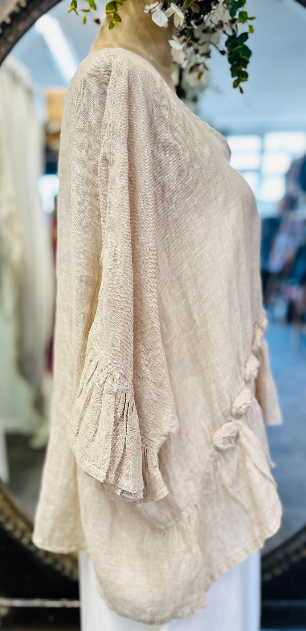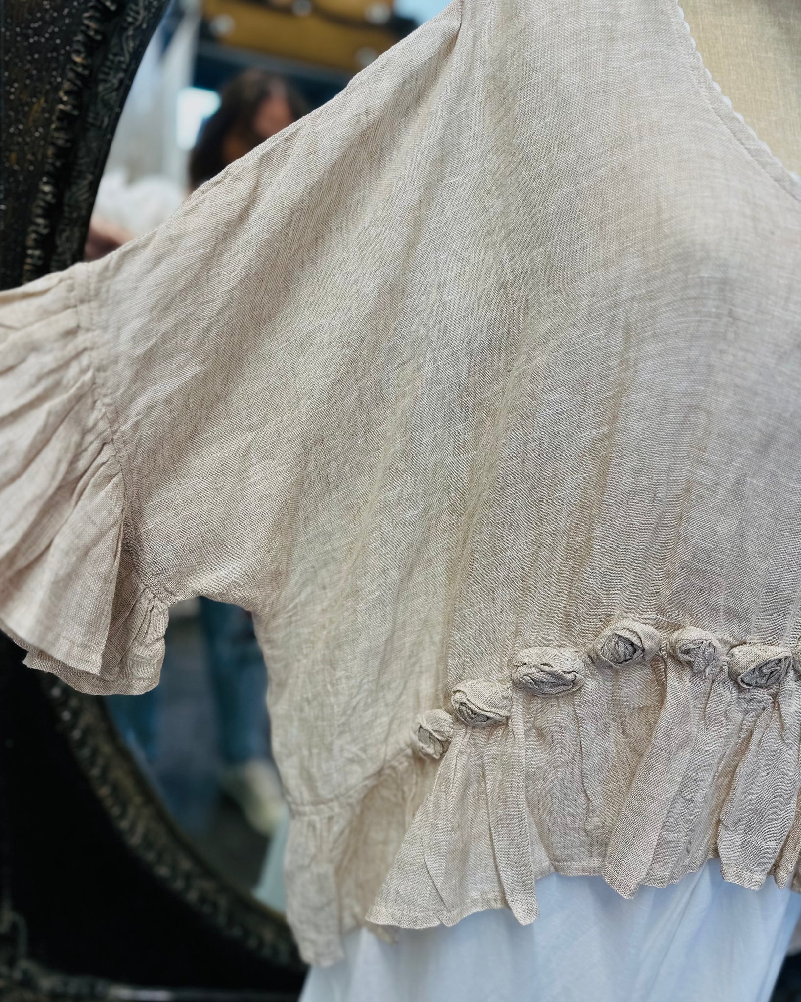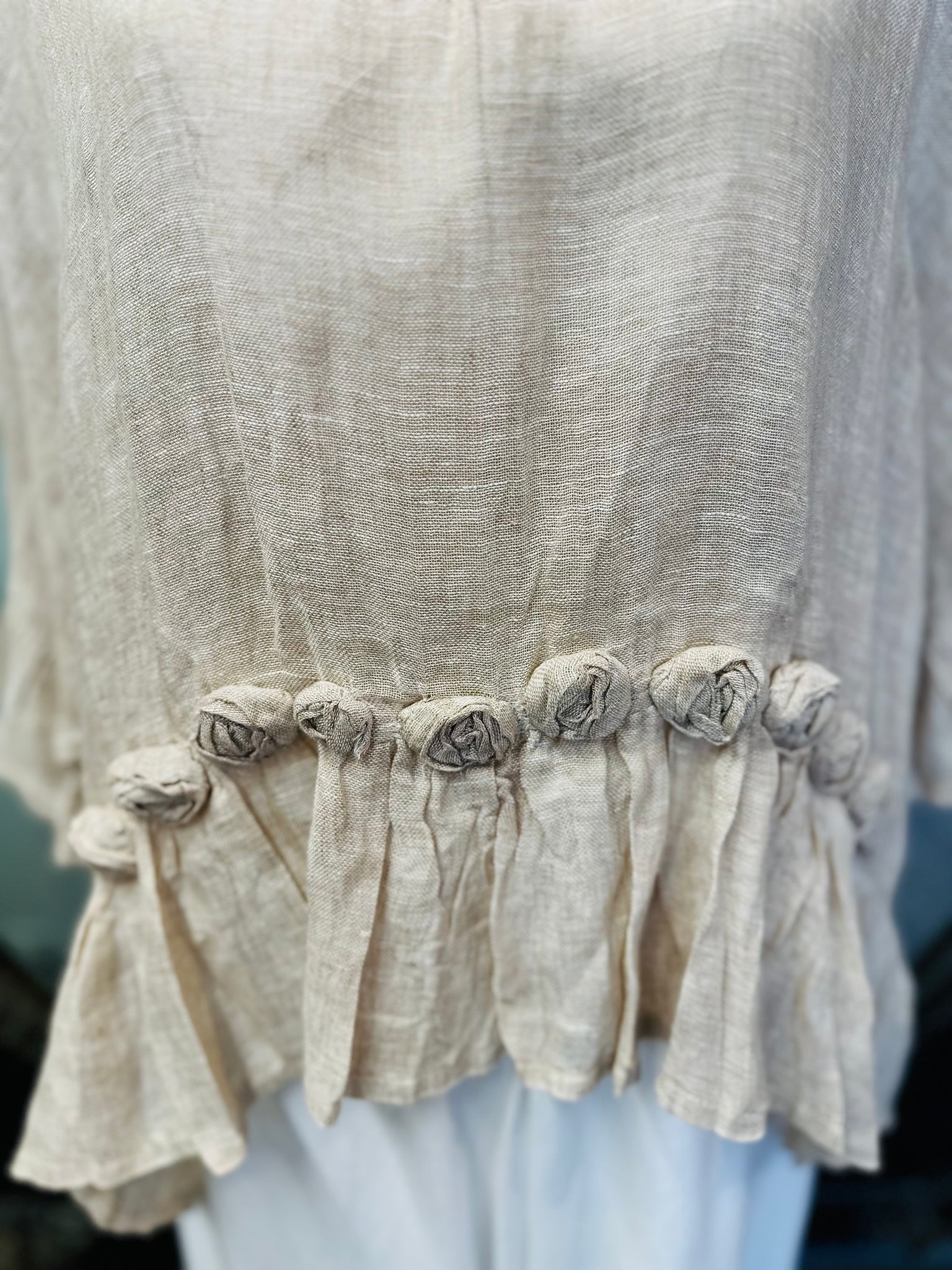 #5957 Soft, flowy and very pretty, this overtop is an original design from Donelle showcasing how versatile the LACE brand is. 100% LINEN in a NATURAL shade featuring our delicate roses and soft frilled sleeve edges, styled to wear formally or simply running errands.