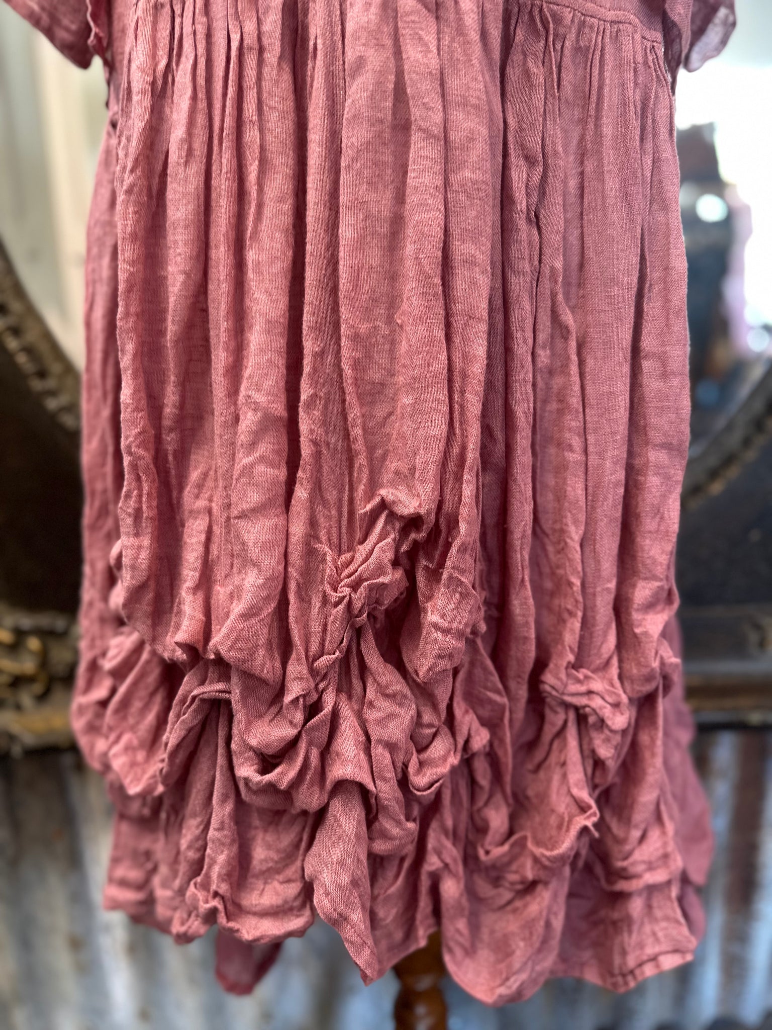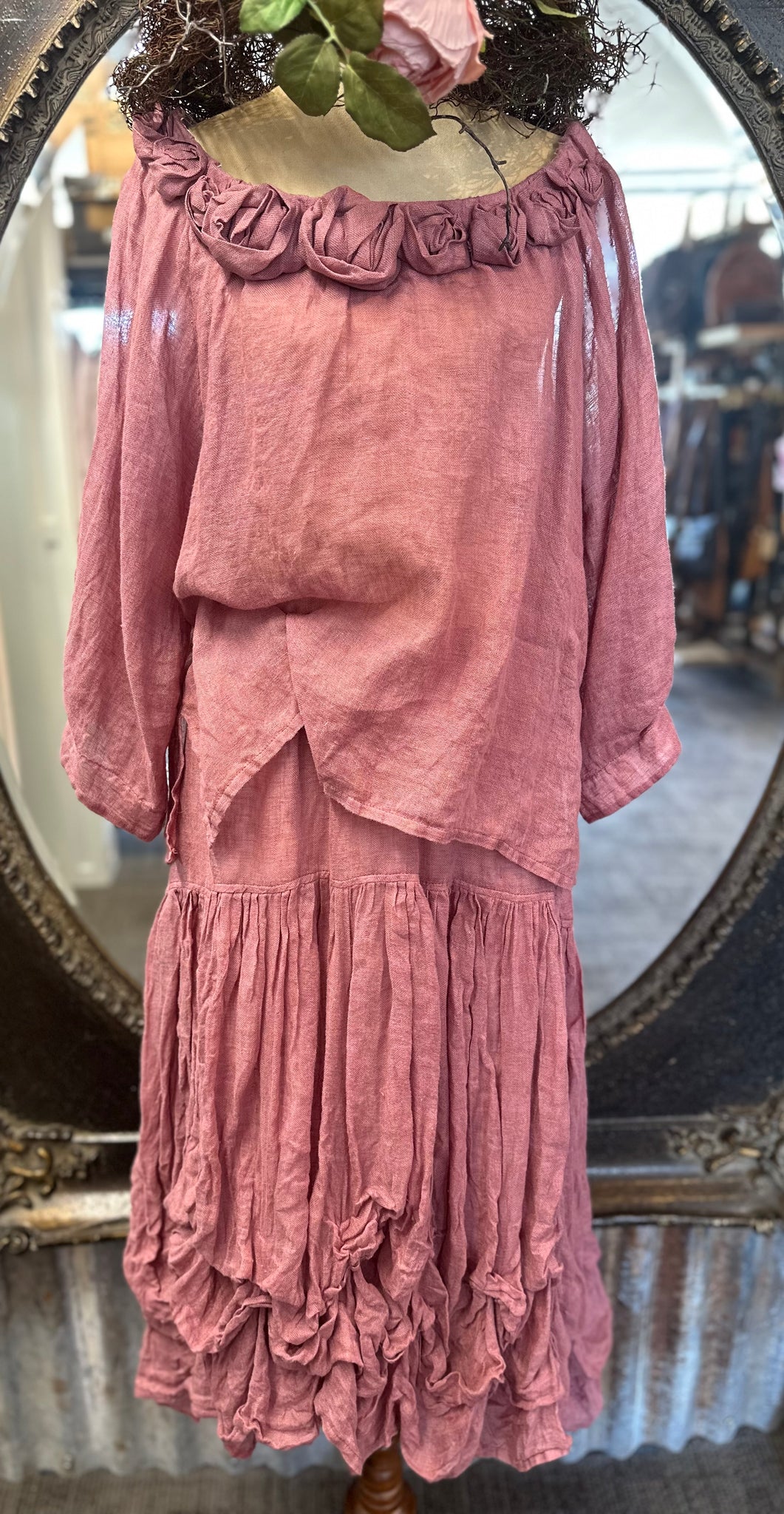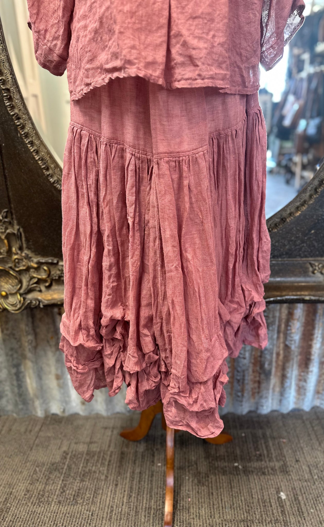 #5861 100% Linen gauze in a soft ROSE hue. This statement piece is a standout at your next event. Gathered from below the hips to ruffles falling to calf length with a high/low hem.