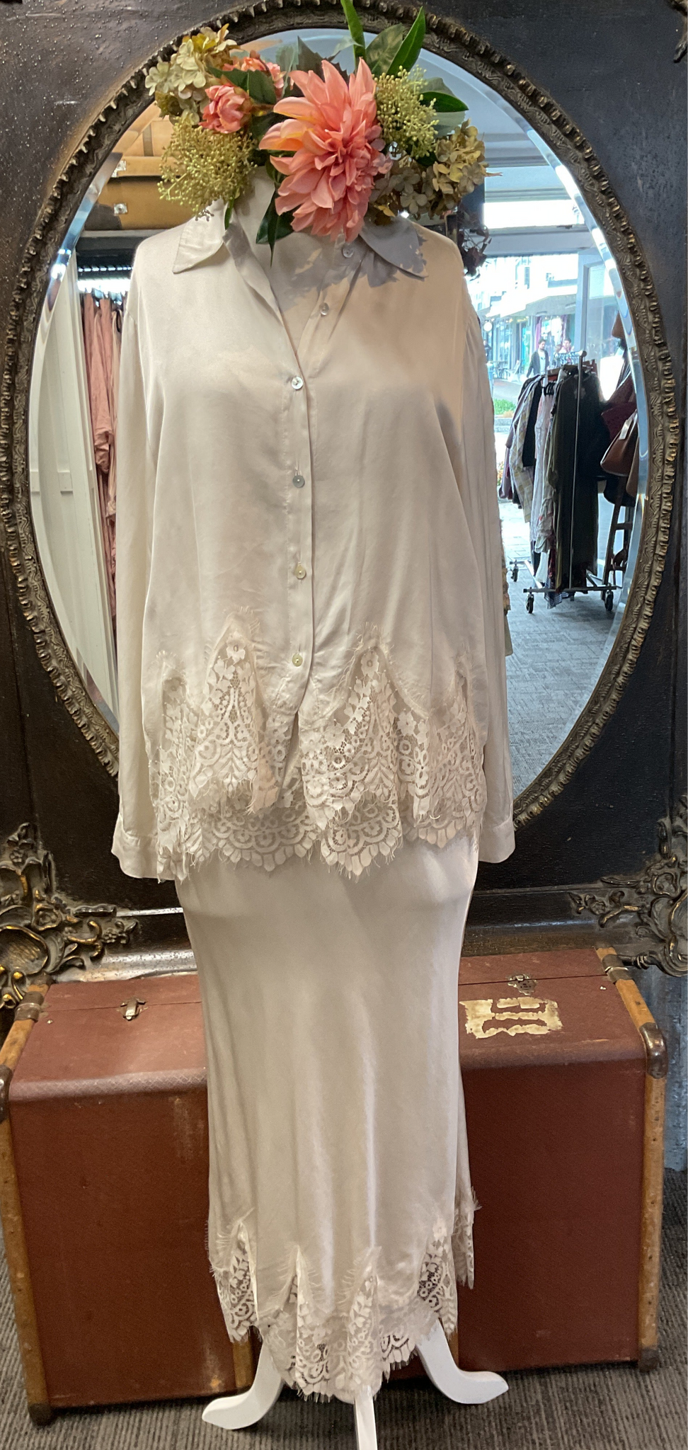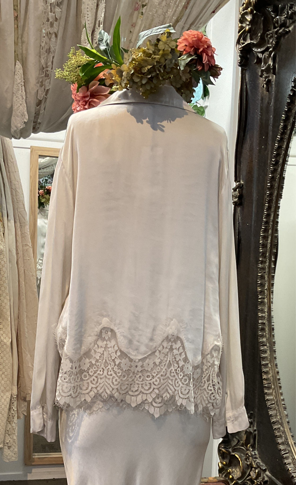 5901 Long Sleeve soft satin viscose shirt designed to match a camisole and skirt. All three are a muted tone of stone to suit most skin tones.