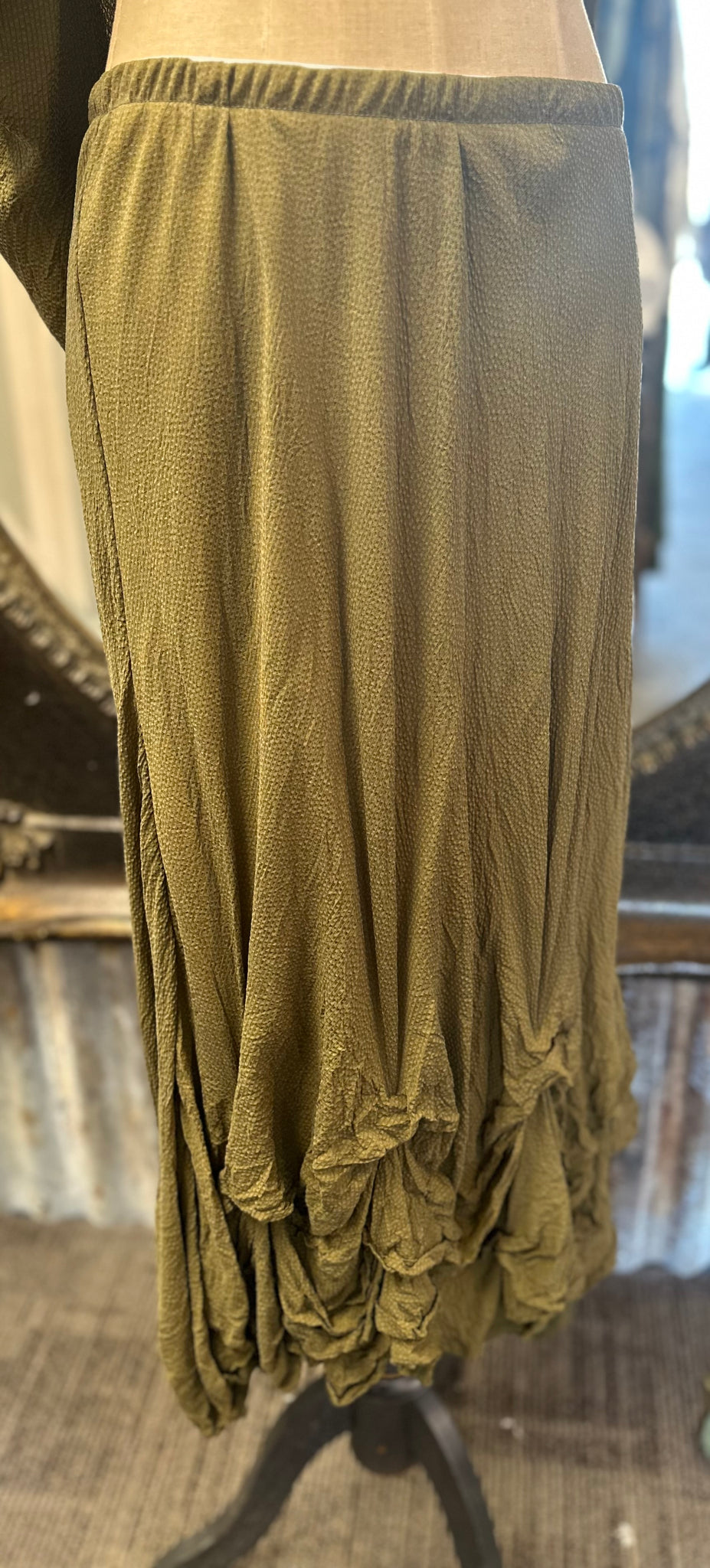 #5730 Our new skirt collection is ready to elevate your wardrobe. Fully lined and Bias cut with an elasticated waistband to ensure soft drape and movement, this design sits comfortably, falling to a flattering high / low hem.