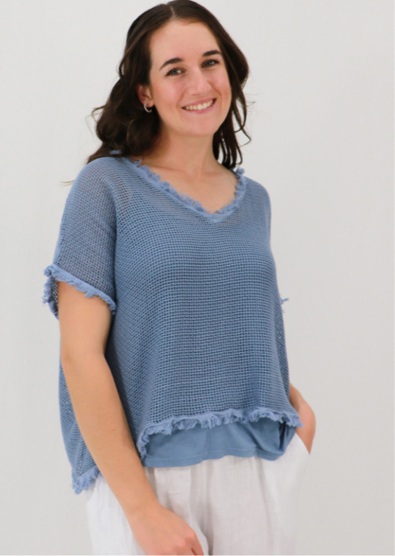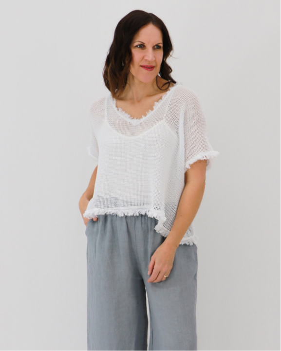 #5865 Made from soft, cotton mesh this tee features a V-neck and raw edges all around. A matching cami is included for easy styling.