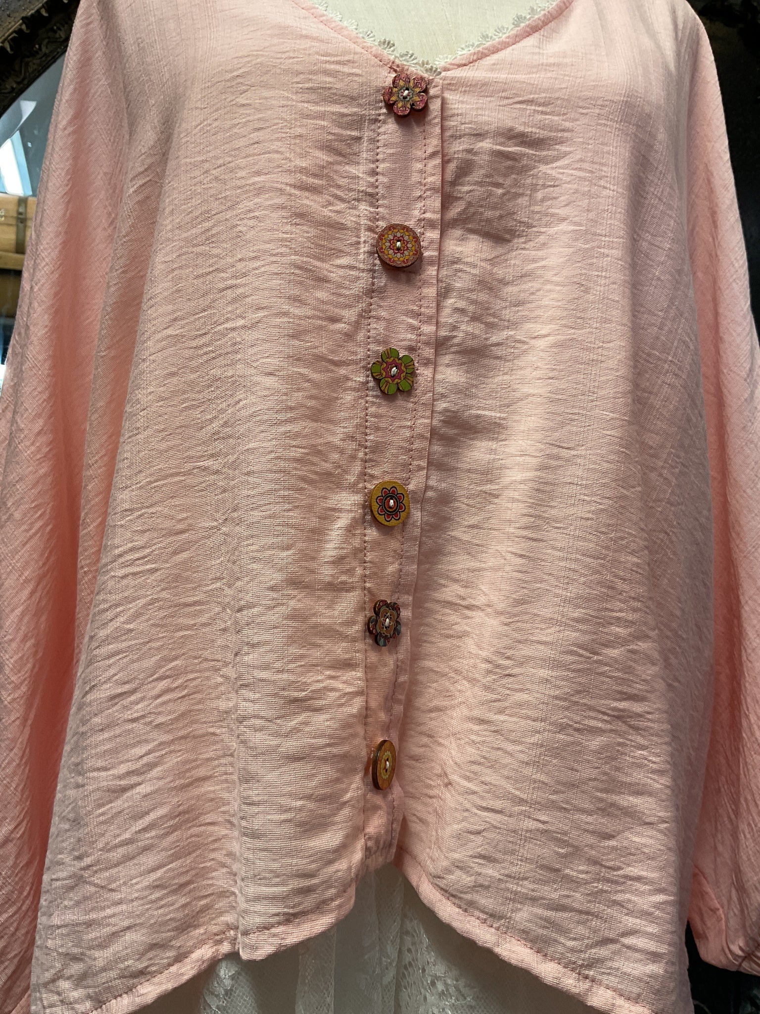 This one is soft rayon featuring frills on the collar. Sleeves are elasticated and the vintage buttons give a nice touch. The back features a flattering pleat and the longer length hem compliments all shapes making this versatile piece a wardrobe staple.
