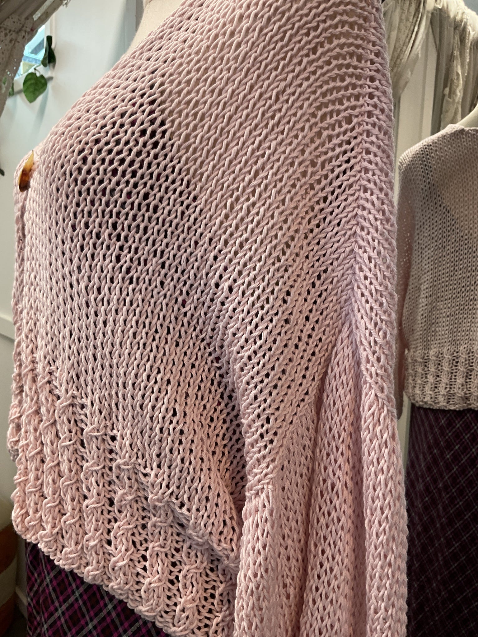 #6180 100% Cotton and locally crafted, this ‘one off’ cardigan is in a pretty pink shade. The cropped length is flattering and the 3/4 sleeves suit all your summer outfits.