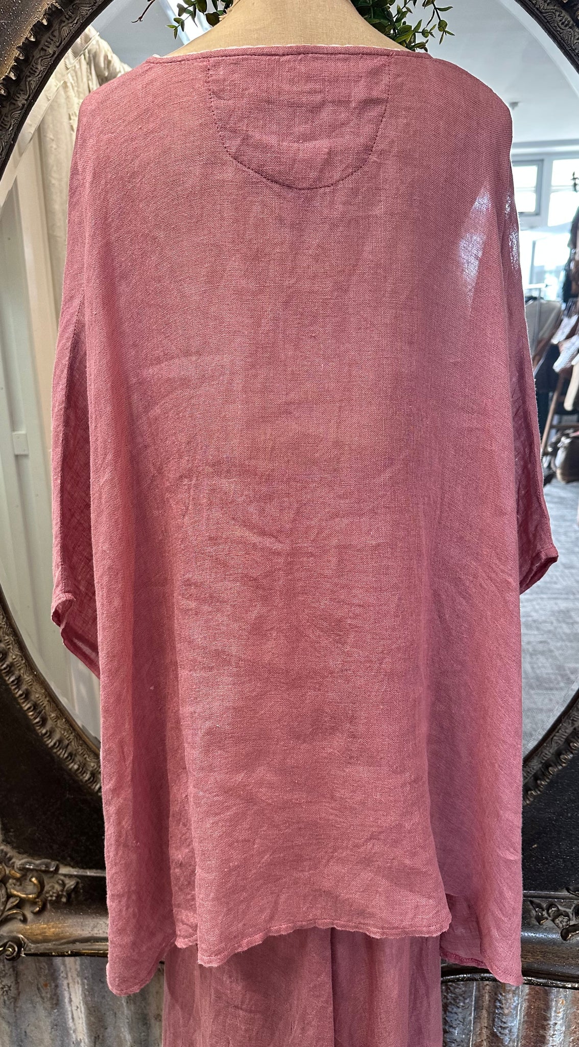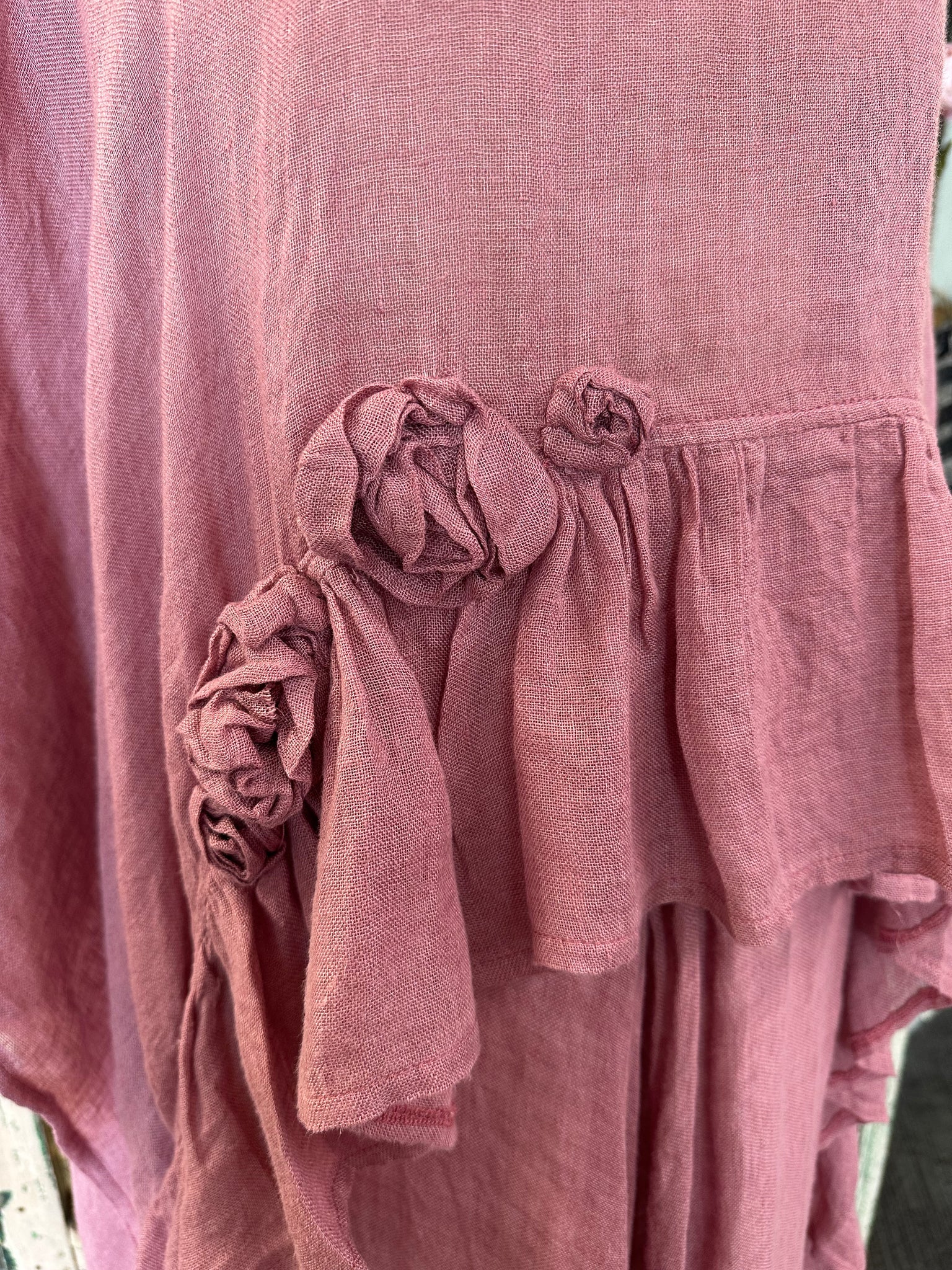 Soft, flowy and very pretty, this overtop is an original design from Donelle showing how versatile the LACE brand is. 100% LINEN fabric in a soft ROSE featuring our delicate roses. This is an edgy longer style to wear formally or simply running errands.