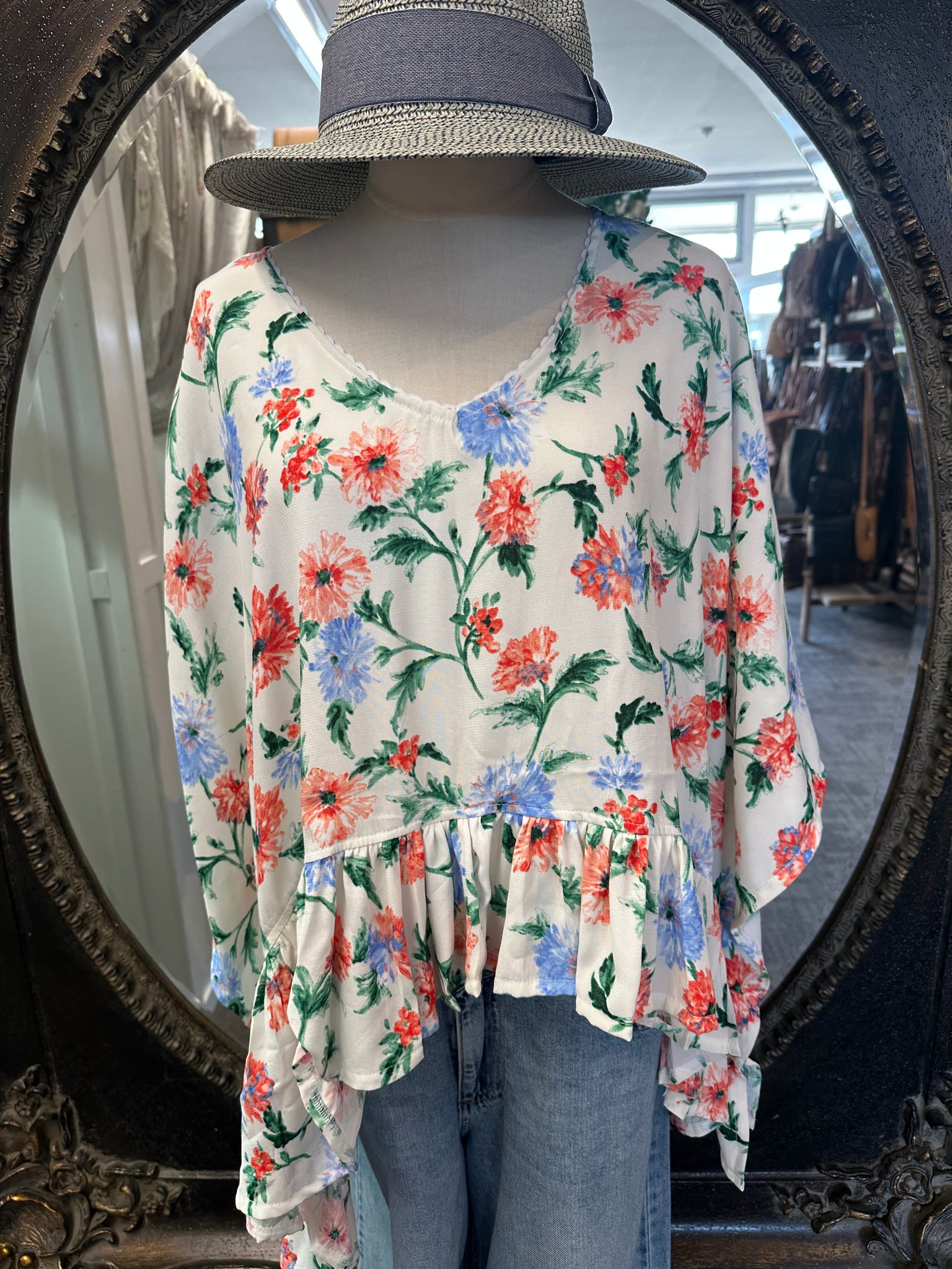 #5956 Soft, flowy and very pretty, this overtop is an original design from Donelle showcasing how versatile the LACE brand is. 100% COTTON fabric in a bright colourful ASTER pattern featuring a delicate frill on the front hem. This high low style can be worn formally or when simply running errands.