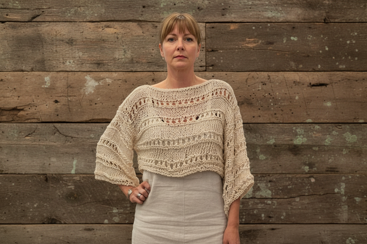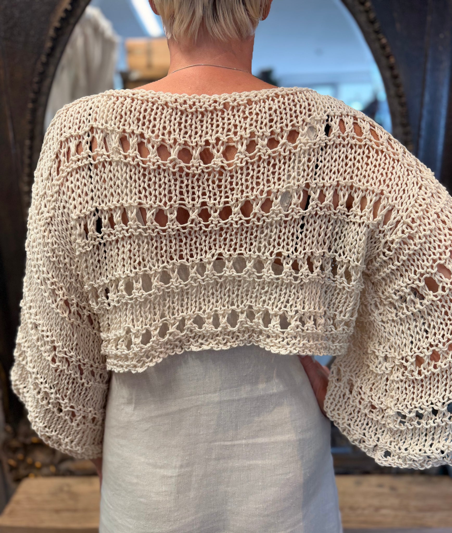 #6086 Hand made cotton sweater in a NATURAL shade. This local knitwear is lovingly crafted in a range of colours and shapes. Chic crop Lacey design with beautiful flared sleeve detail